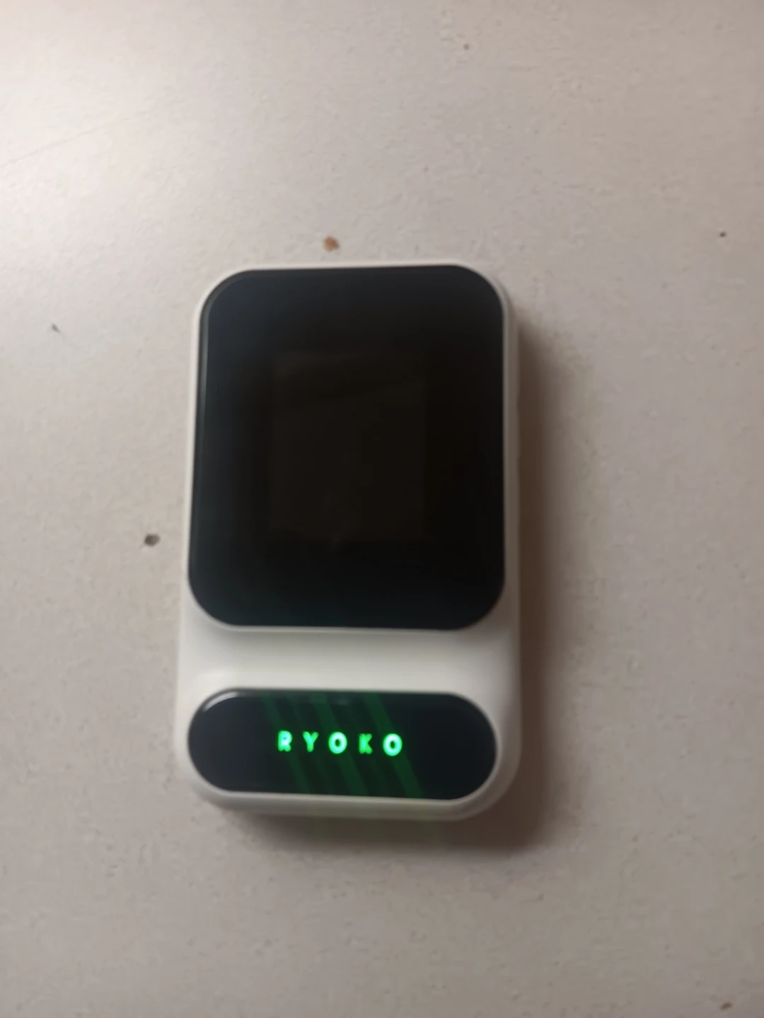 This is a RYOKO portable Wi-Fi hotspot device. It's white with a black screen and a green illuminated RYOKO logo. This device is great for staying connected on the go!