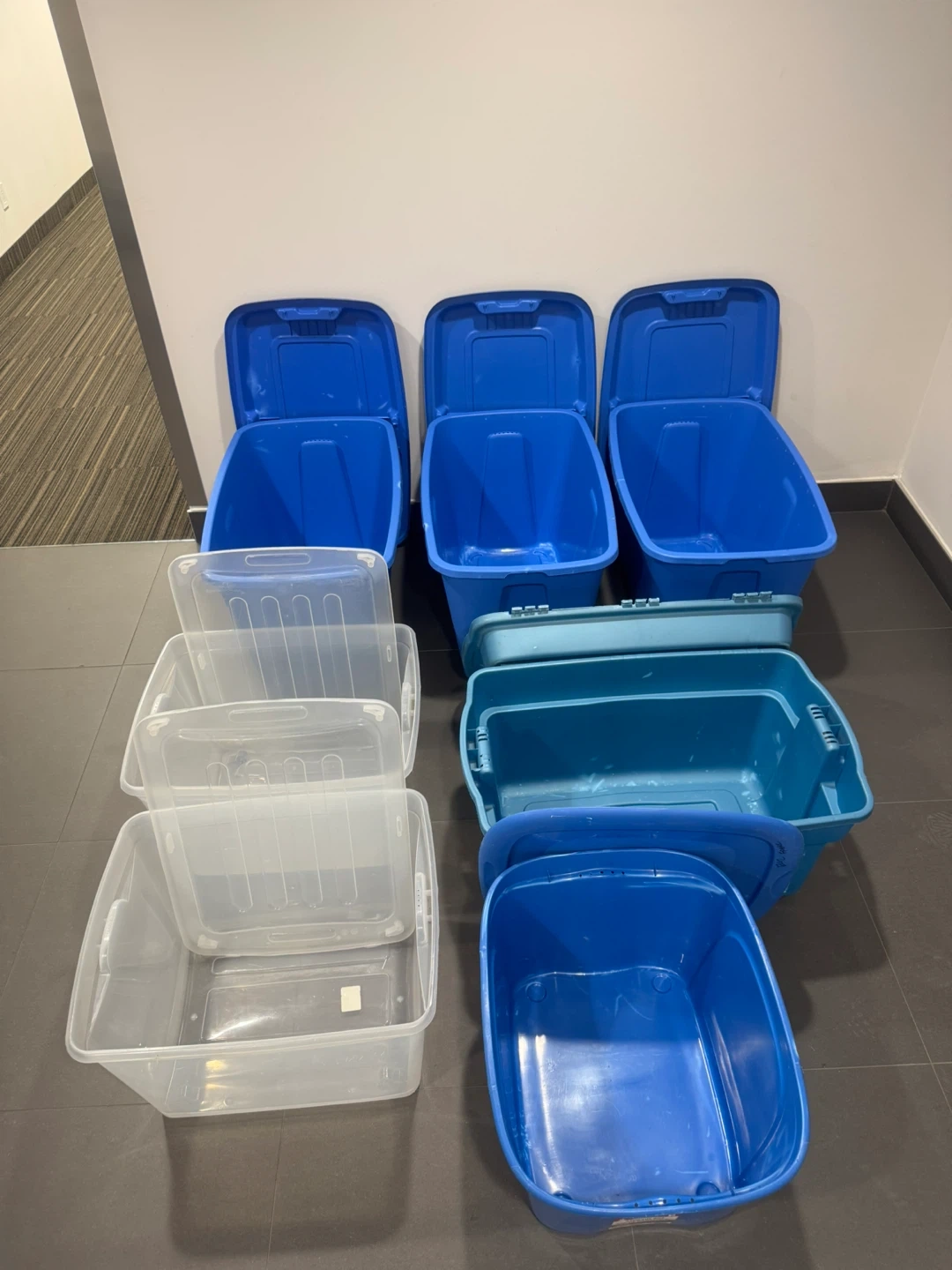 7 Large and X-Large Storage Tote Bins with Lids All for $30- Great as Moving Boxes or Spring Cleaning - all very Clean, mostly stored fabric and patterns and books - each one has been wiped out perfectly clean.