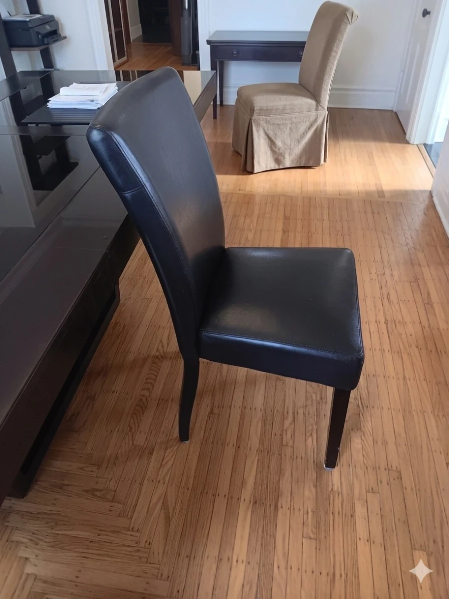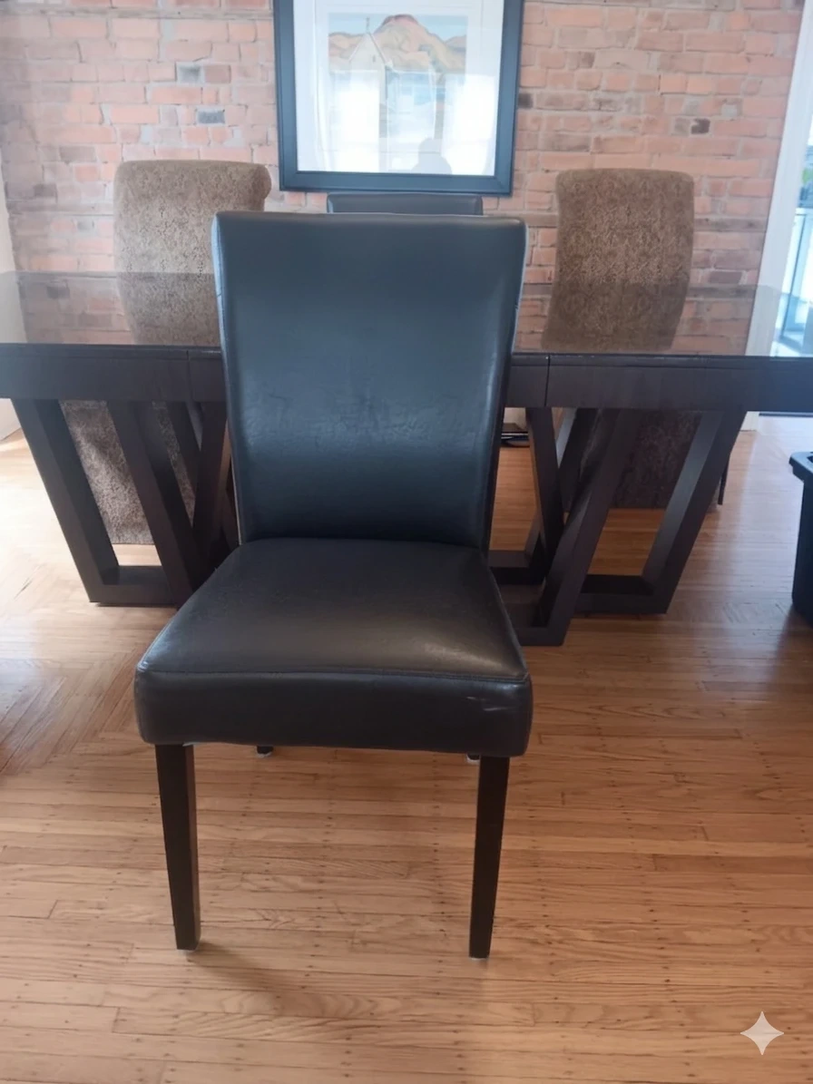 These are stylish faux leather dining chairs in a classic black colour. Comfortable and designed to fit any dining room. The chairs' simple elegance makes it a great addition to your table.