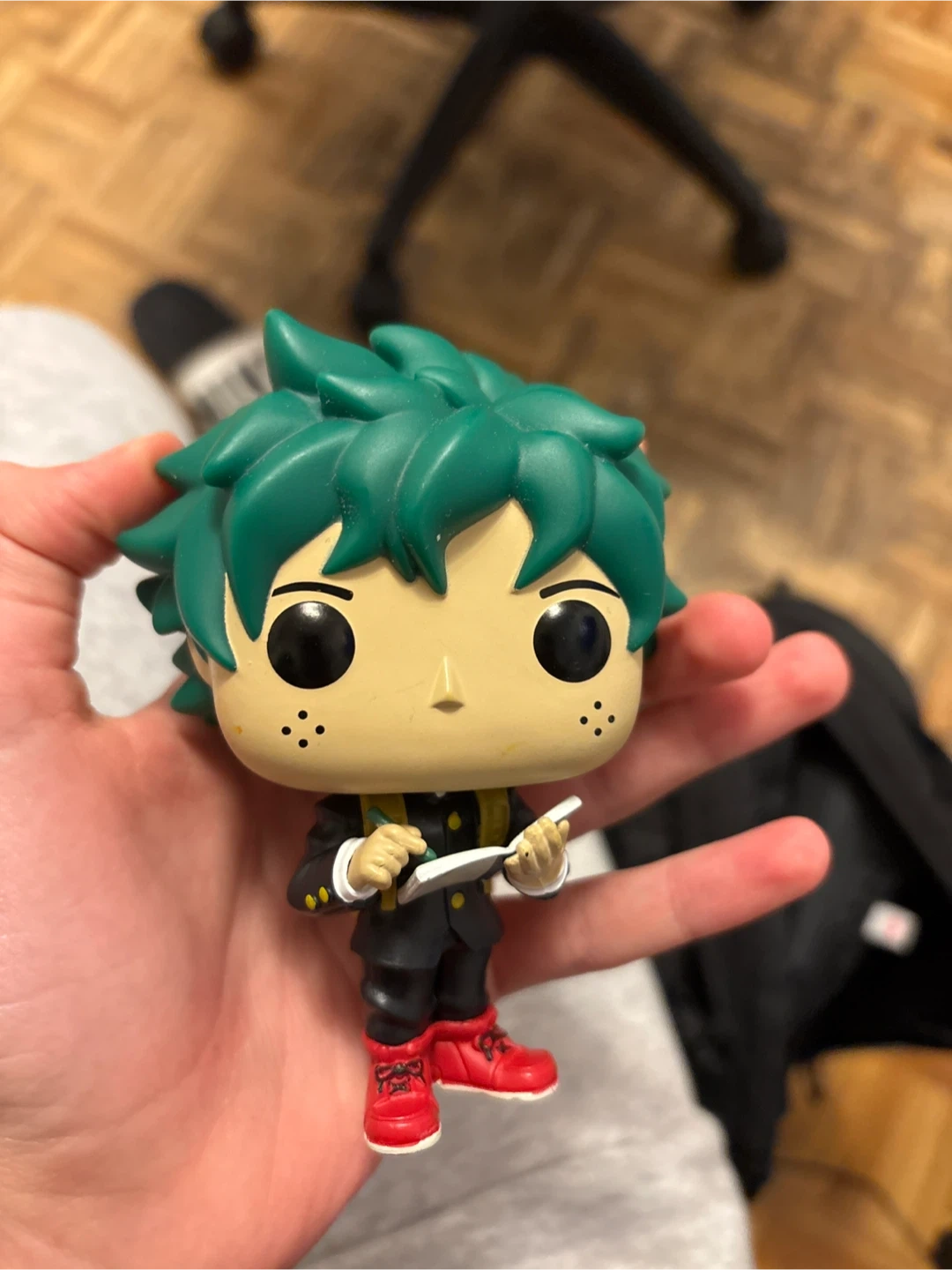 This is a Funko Pop! vinyl figure of Izuku Midoriya from My Hero Academia. It features his distinctive green spiky hair and school uniform. The figure stands about 3.75 inches tall. It's a great collectible for fans of the anime series!