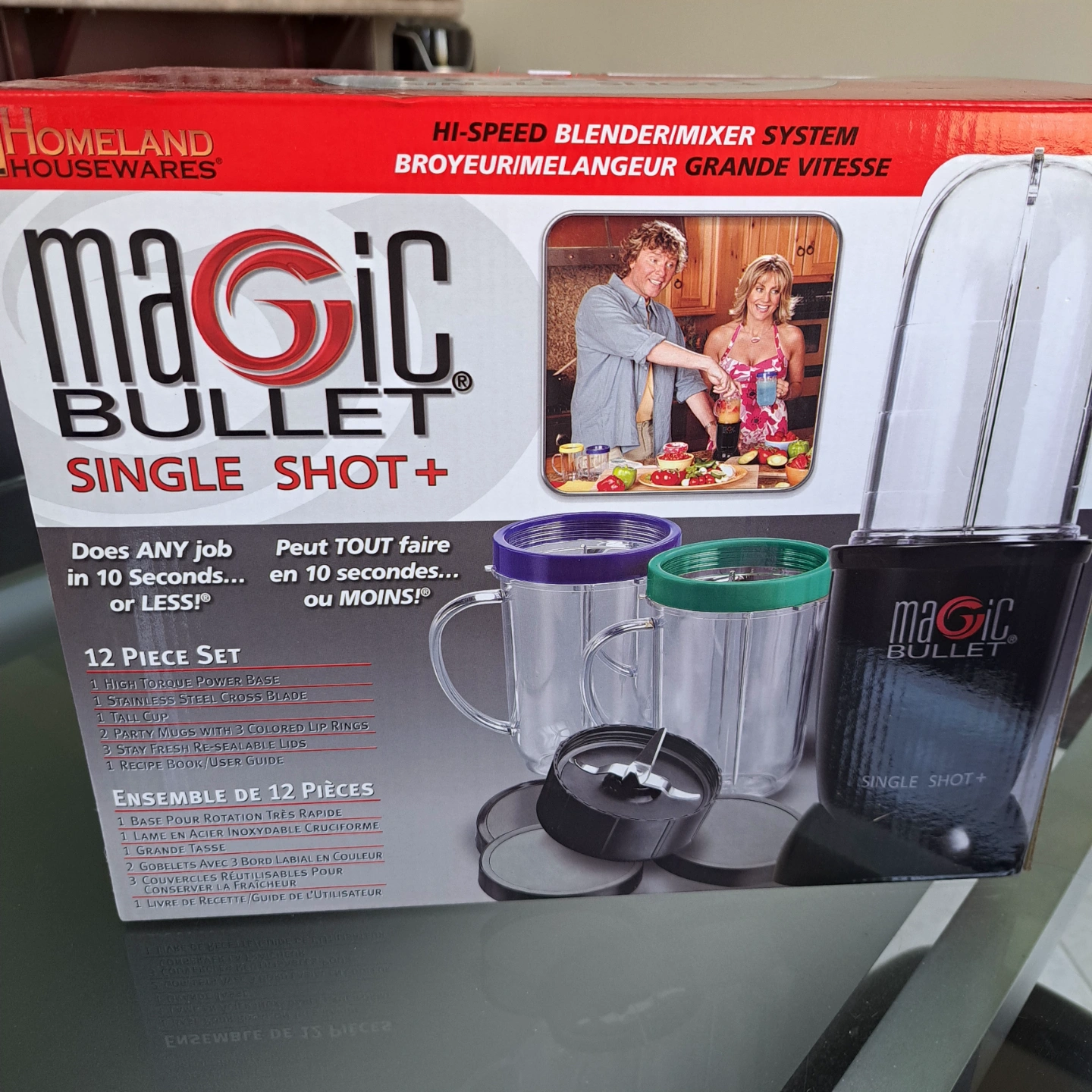 New in box, 12-piece set. Includes high-speed blender, tall cup, party mugs, lip rings, stainless steel cross blade, recipe book, and user guide. Makes smoothies, dips, and more in seconds.