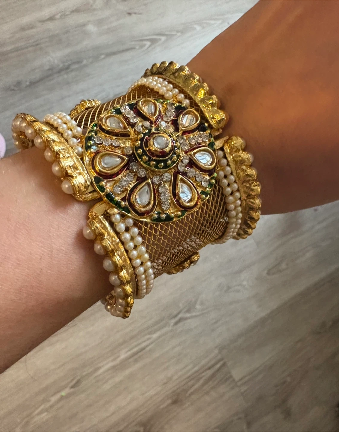 Beautiful gold-tone cuff bracelet featuring pearl and stone detailing! It's in great condition and ready to add a touch of elegance to any outfit