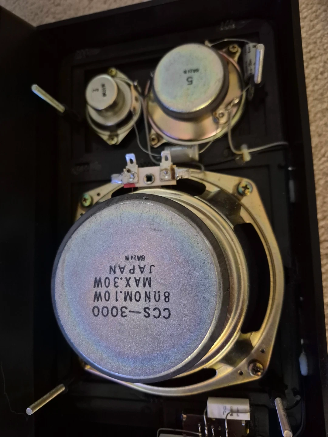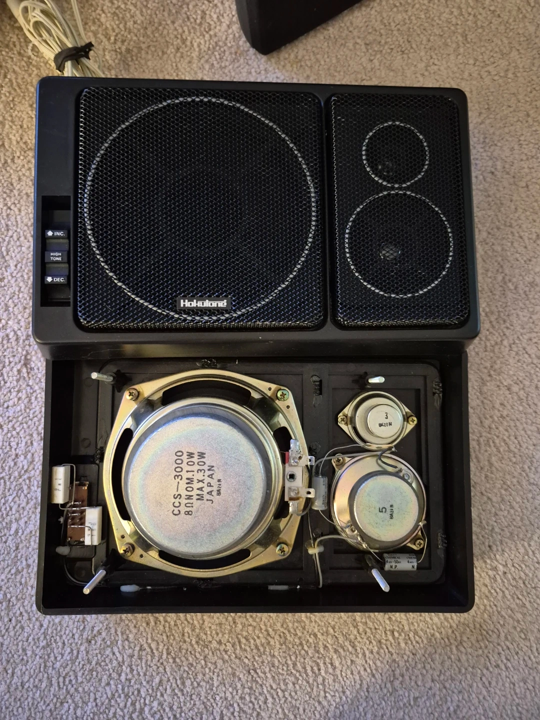 Selling a Hokutone CCS-3000 speaker system! It's a cool vintage piece with a unique design. The speaker is black and features a high/low tone adjustment switch. It's marked with '8N OM.10W MAX.30W JAPAN'.