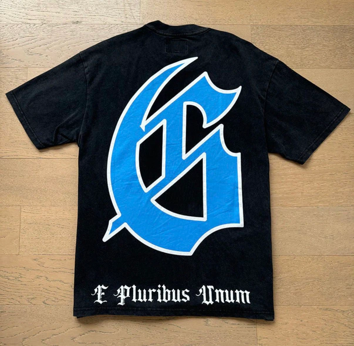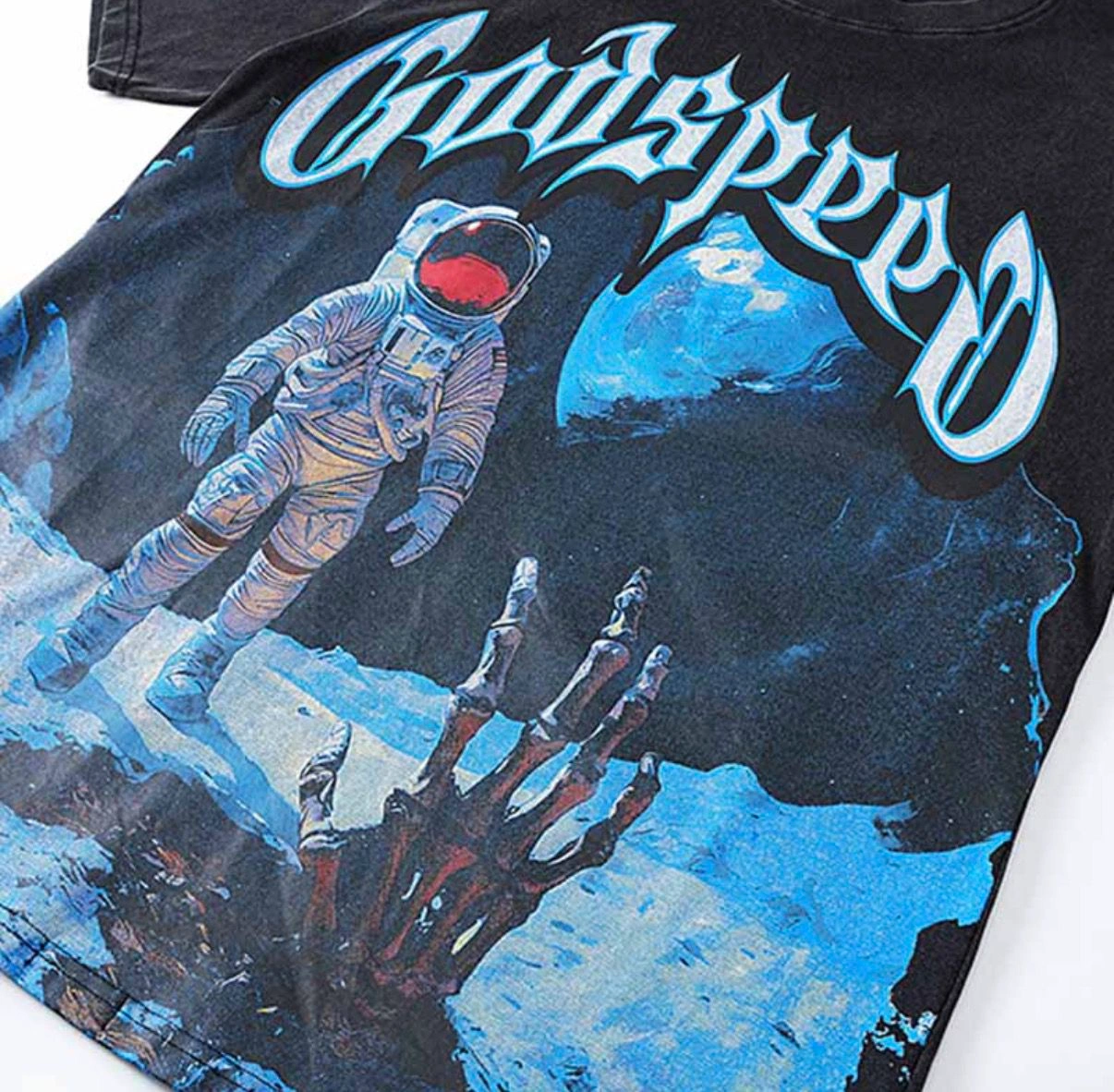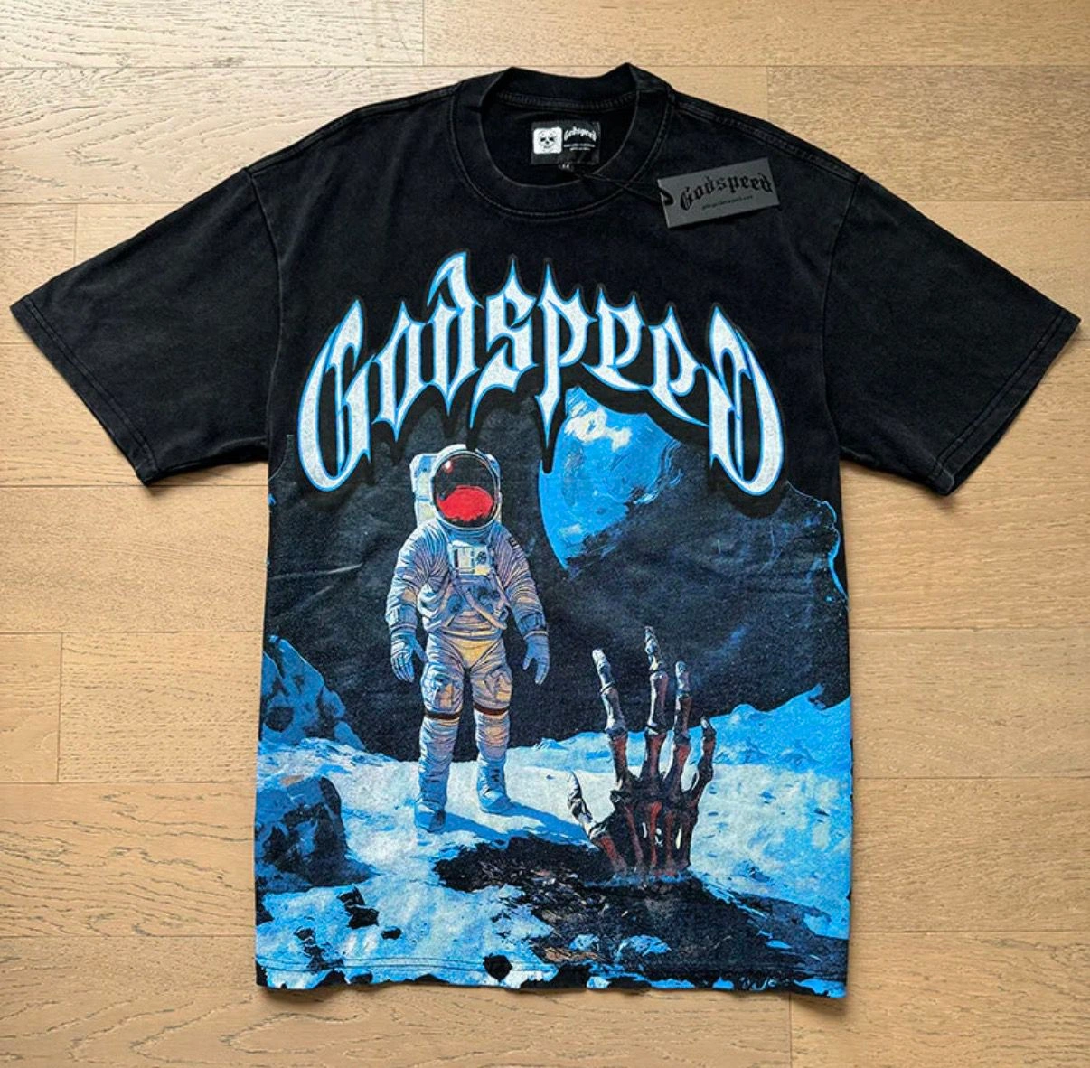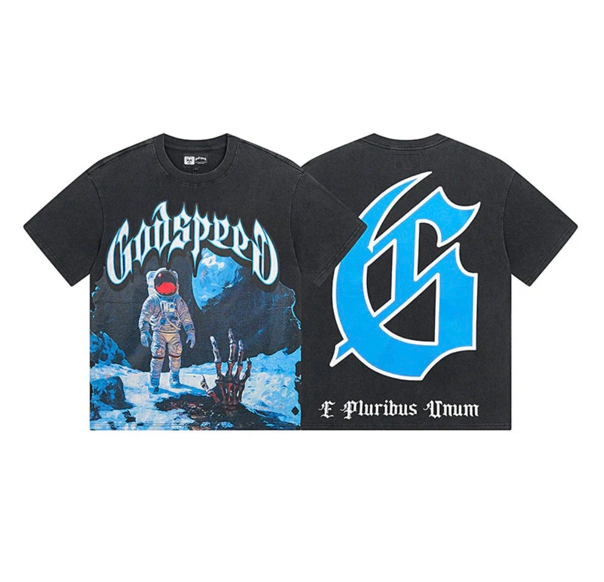Black Godspeed graphic t-shirt with an astronaut and skeleton hand design. Features a large blue 'G' logo on the back with 'E Pluribus Unum' text. 100% Cotton.
