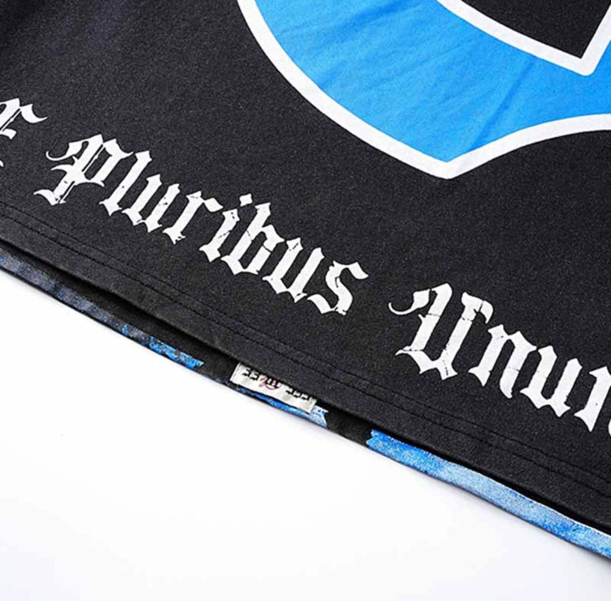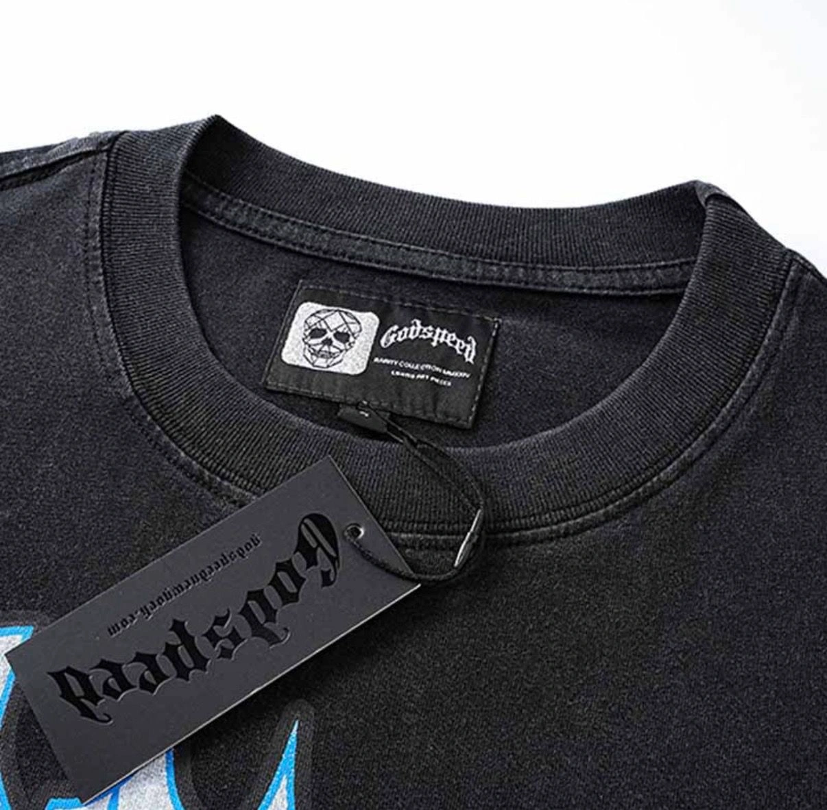 Black Godspeed graphic t-shirt with an astronaut and skeleton hand design. Features a large blue 'G' logo on the back with 'E Pluribus Unum' text. 100% Cotton.