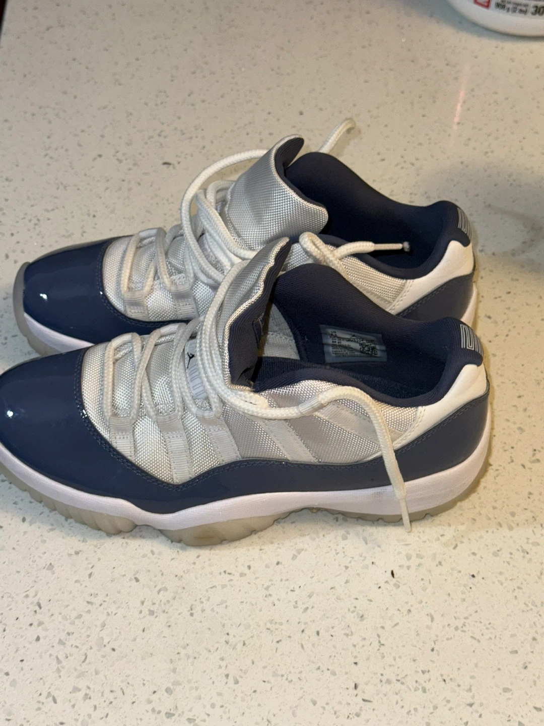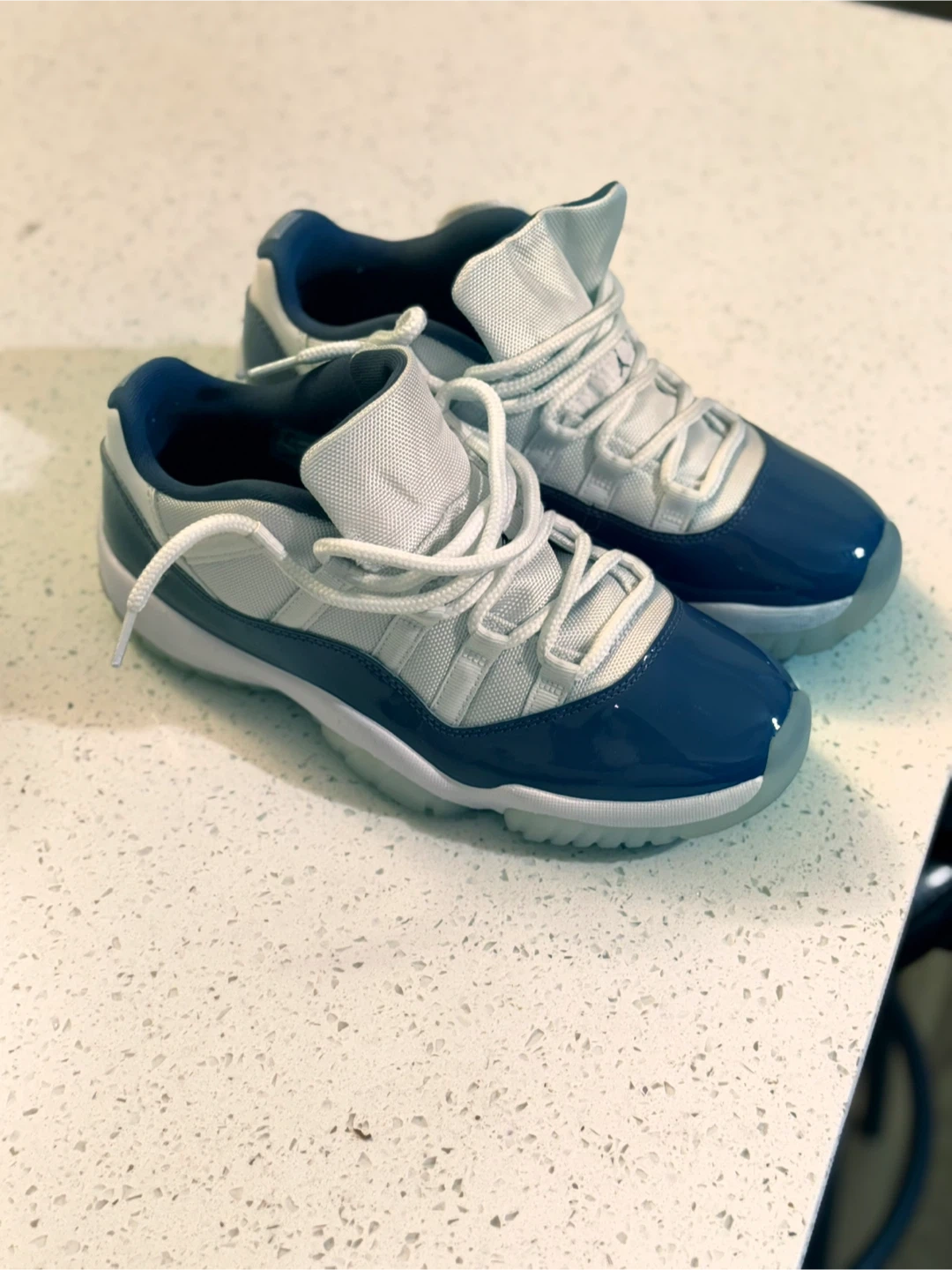 These are Air Jordan 11 Retro sneakers in a women's size 8.5. They feature a white and navy colourway with a patent leather mudguard. The soles are translucent.