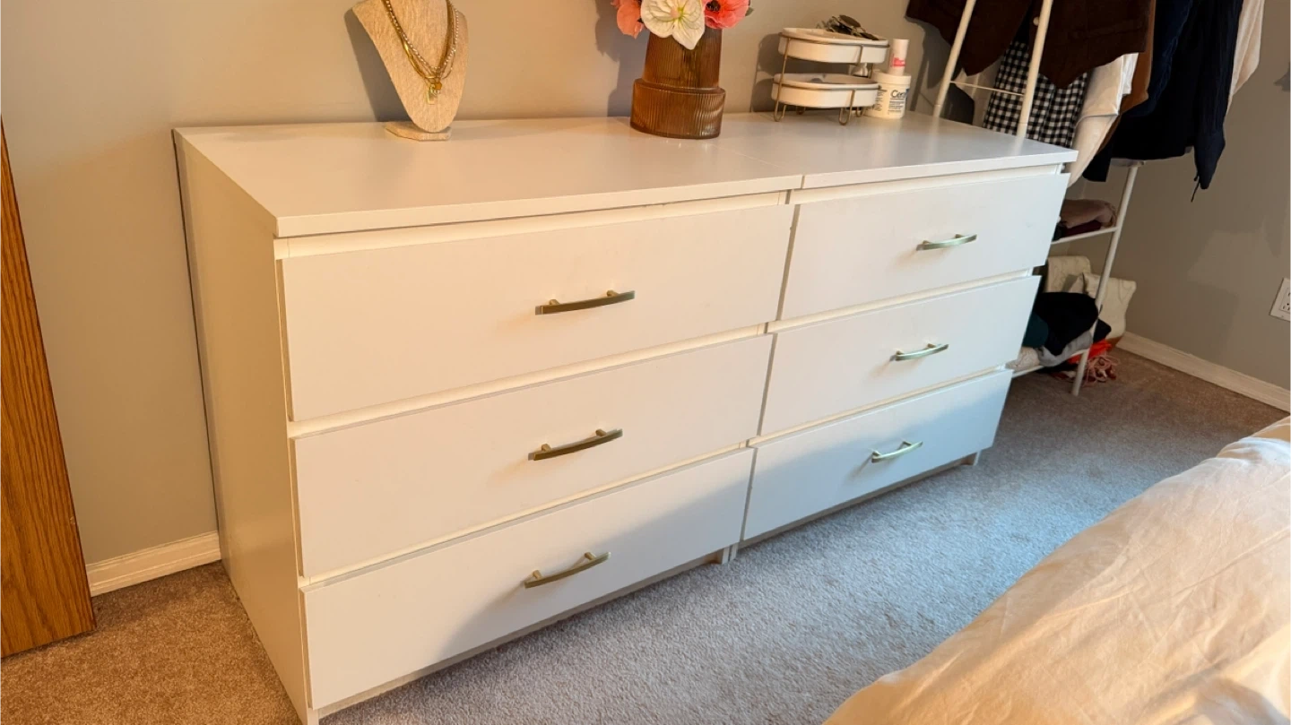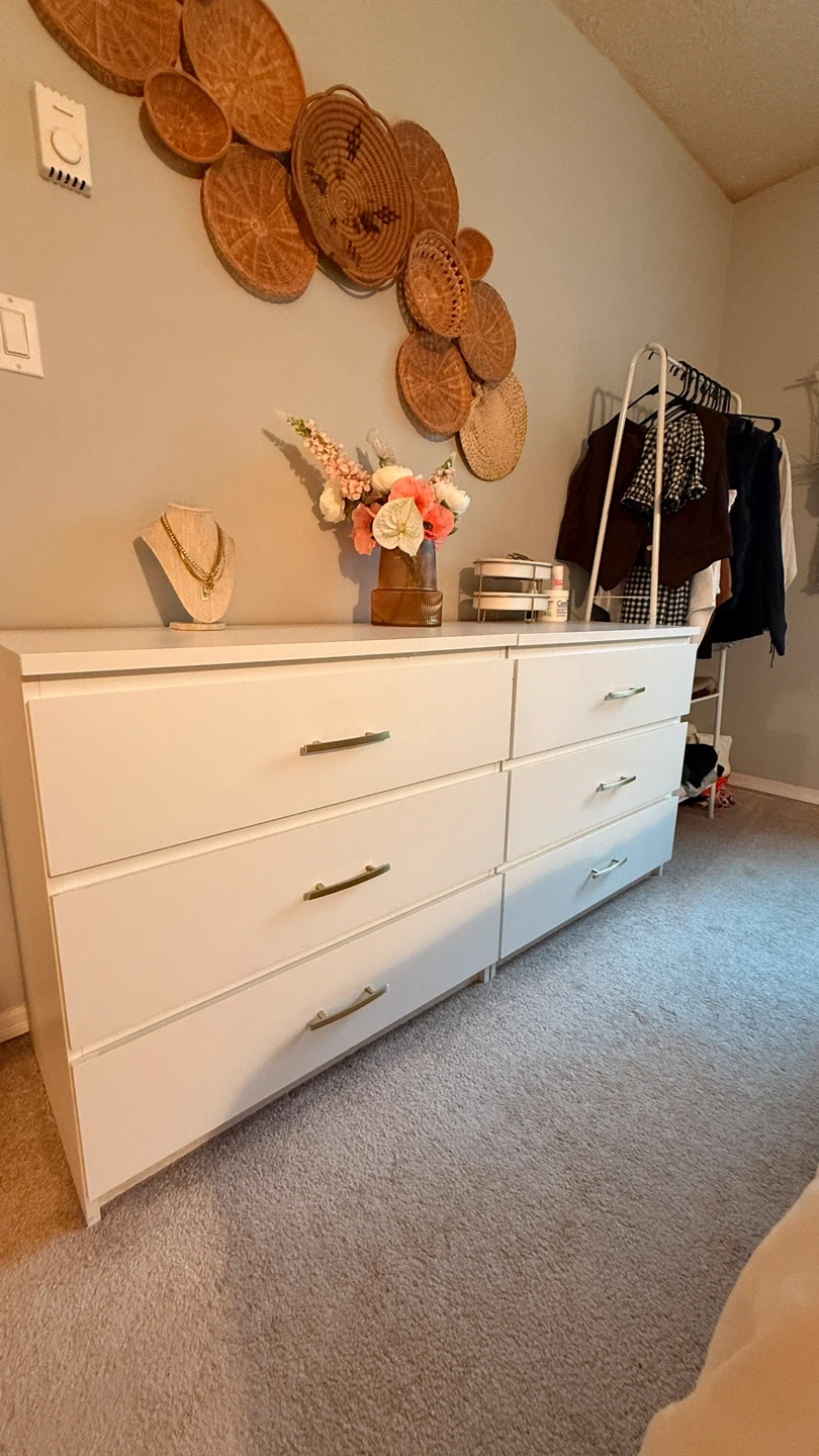 Two 3 drawer dressers, that you can put together to be a 6 drawer dresser. Add brushed gold drawer pull handles. Tons of storage!