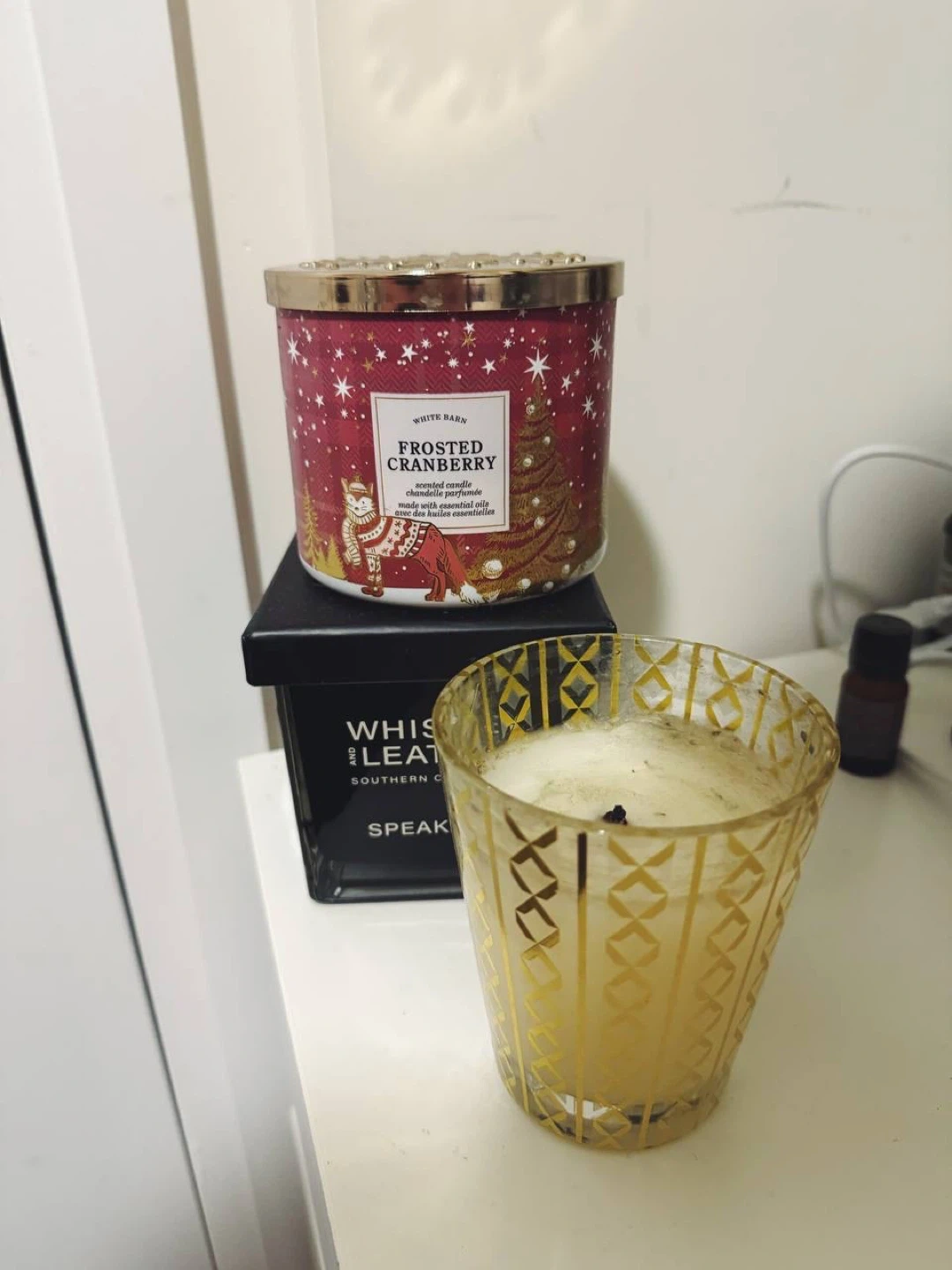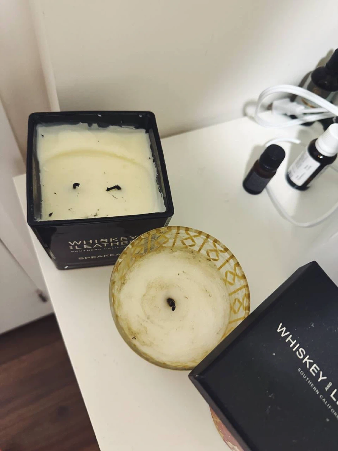 • Black candle (Whiskey & Leather style) — approx. 90% remaining