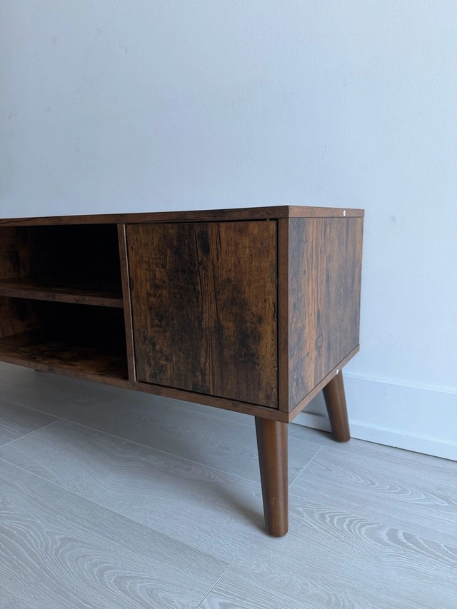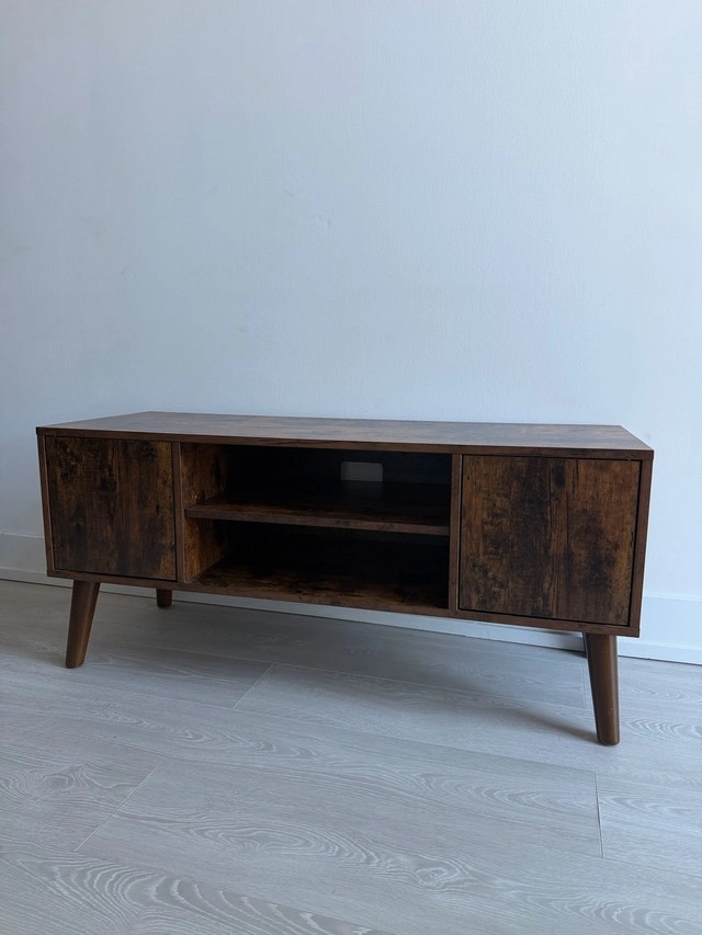 This handsome TV stand accommodates televisions up to 42 inches, featuring a mid-century modern design that adds a touch of retro elegance to any living room. It is in used condition, but has been well cared for. It includes shelving and storage behind doors. Let me know if you're interested!