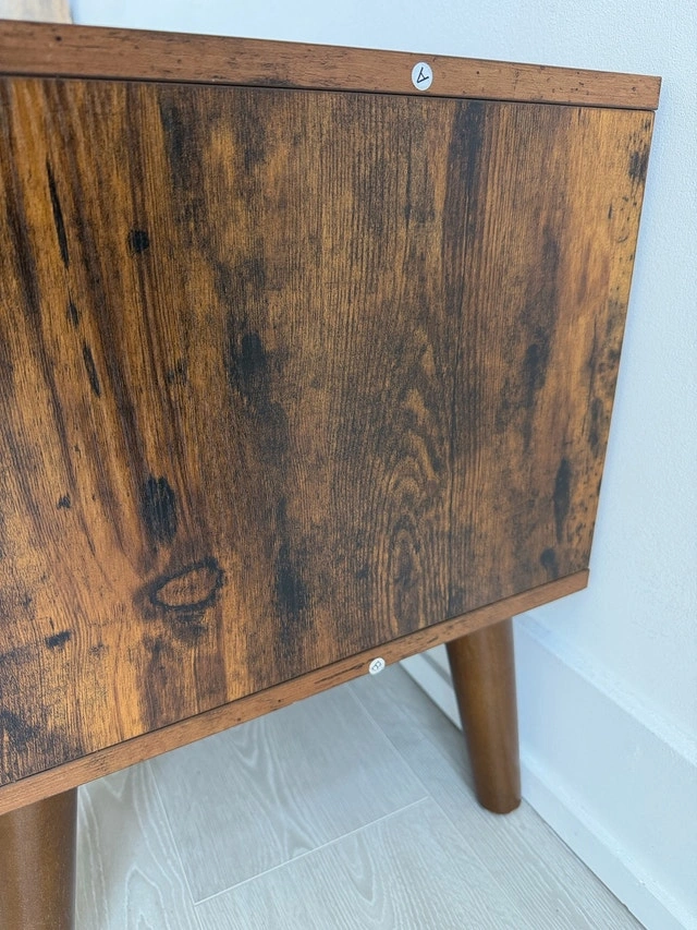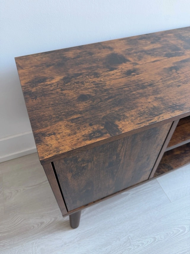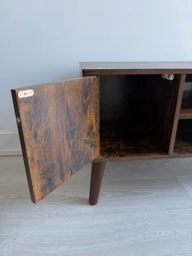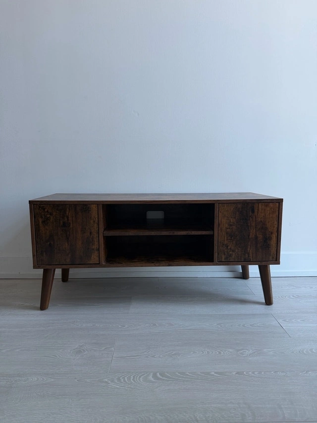 This handsome TV stand accommodates televisions up to 42 inches, featuring a mid-century modern design that adds a touch of retro elegance to any living room. It is in used condition, but has been well cared for. It includes shelving and storage behind doors. Let me know if you're interested!