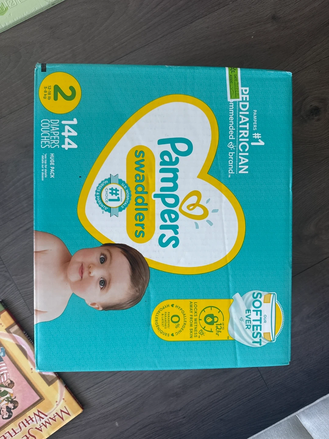 Pampers Swaddlers diapers in size 2. Huge pack with 144 diapers included. They're #1 recommended by pediatricians, nurses, and parents. Hypoallergenic and locks wetness away for up to 12 hours.