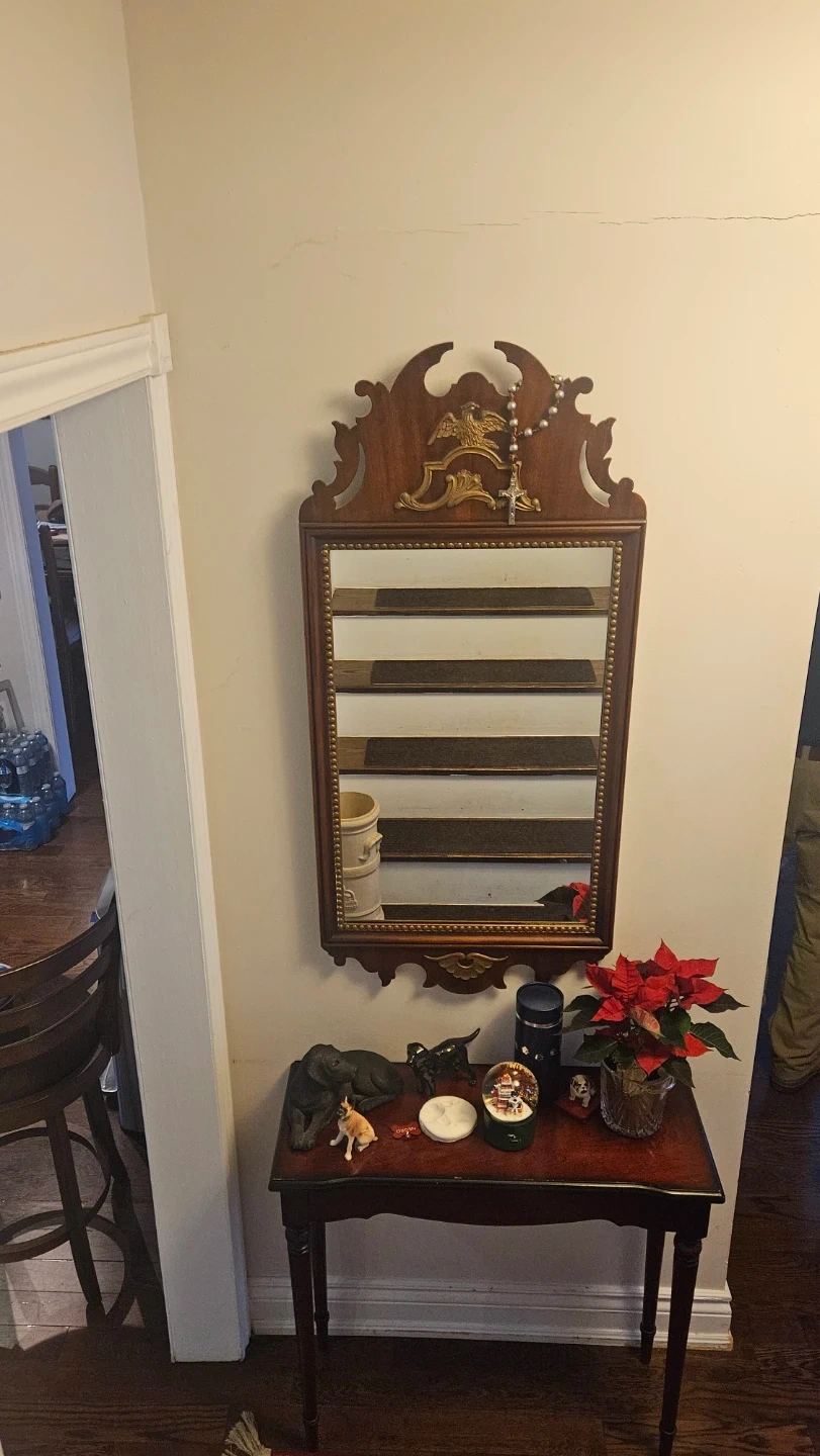 Selling a vintage wooden entrance table with a mirror. It has a unique, ornate design with a small shelf below the mirror. It would be a lovely addition to any entrance!