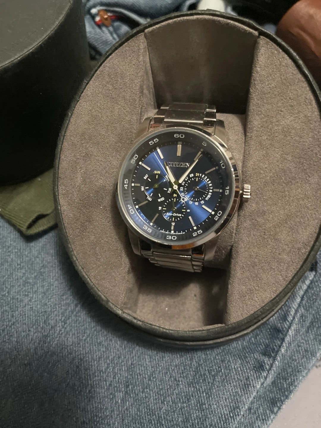Medium faced blue sapphire mixed with obsidian and silver Eco drive citizen watch!! U never need a battery well for minimum of 10yrs as most know they run solar why more