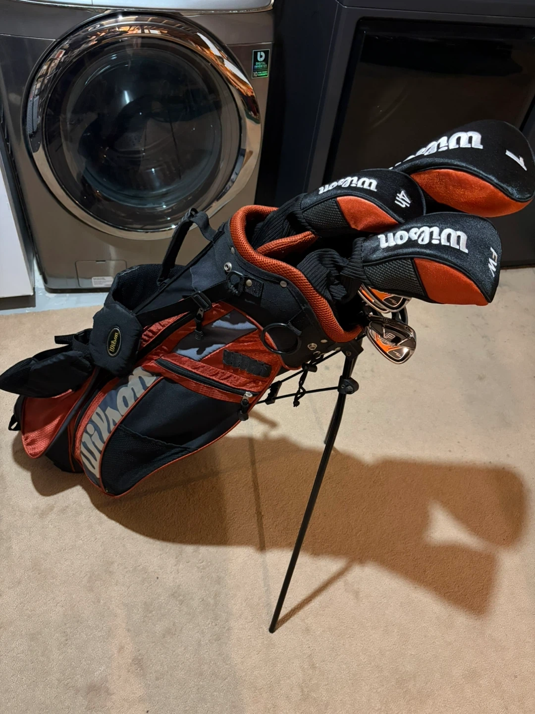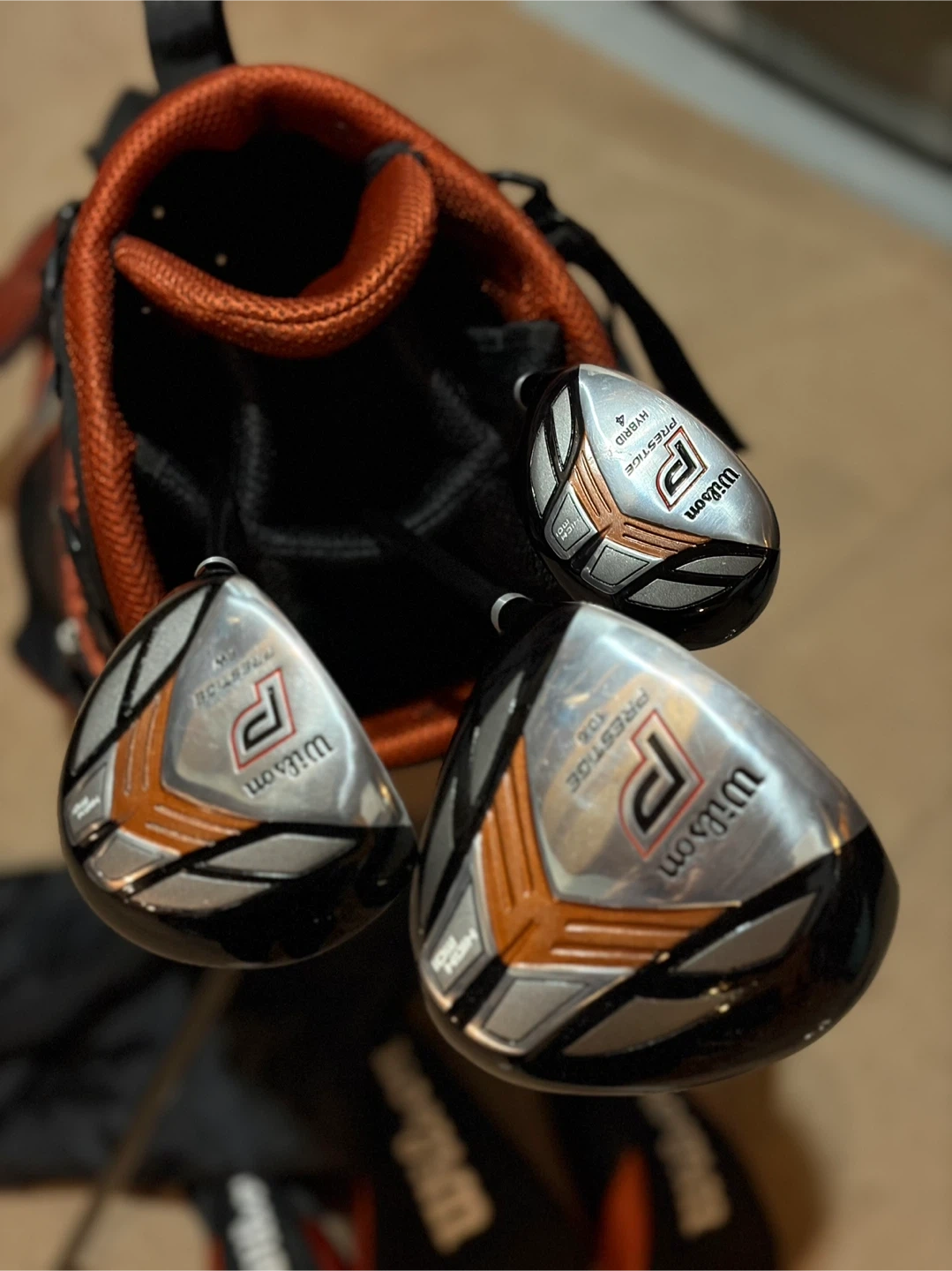 Complete Wilson Prestige golf club set with a stand bag. Includes irons and woods with High MOI technology for better performance. Bag is black and orange.