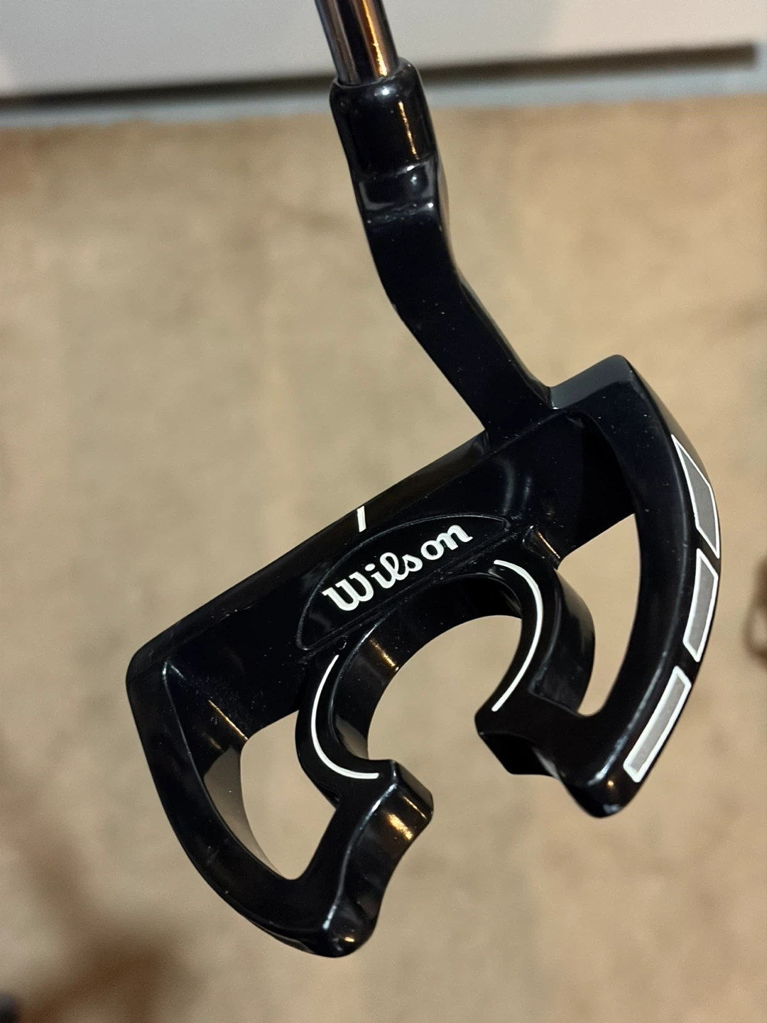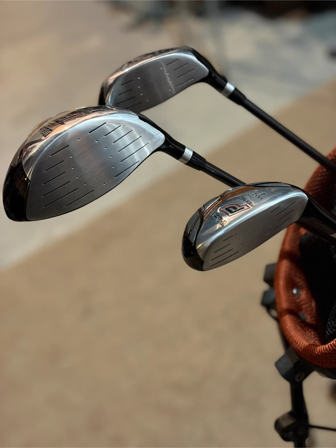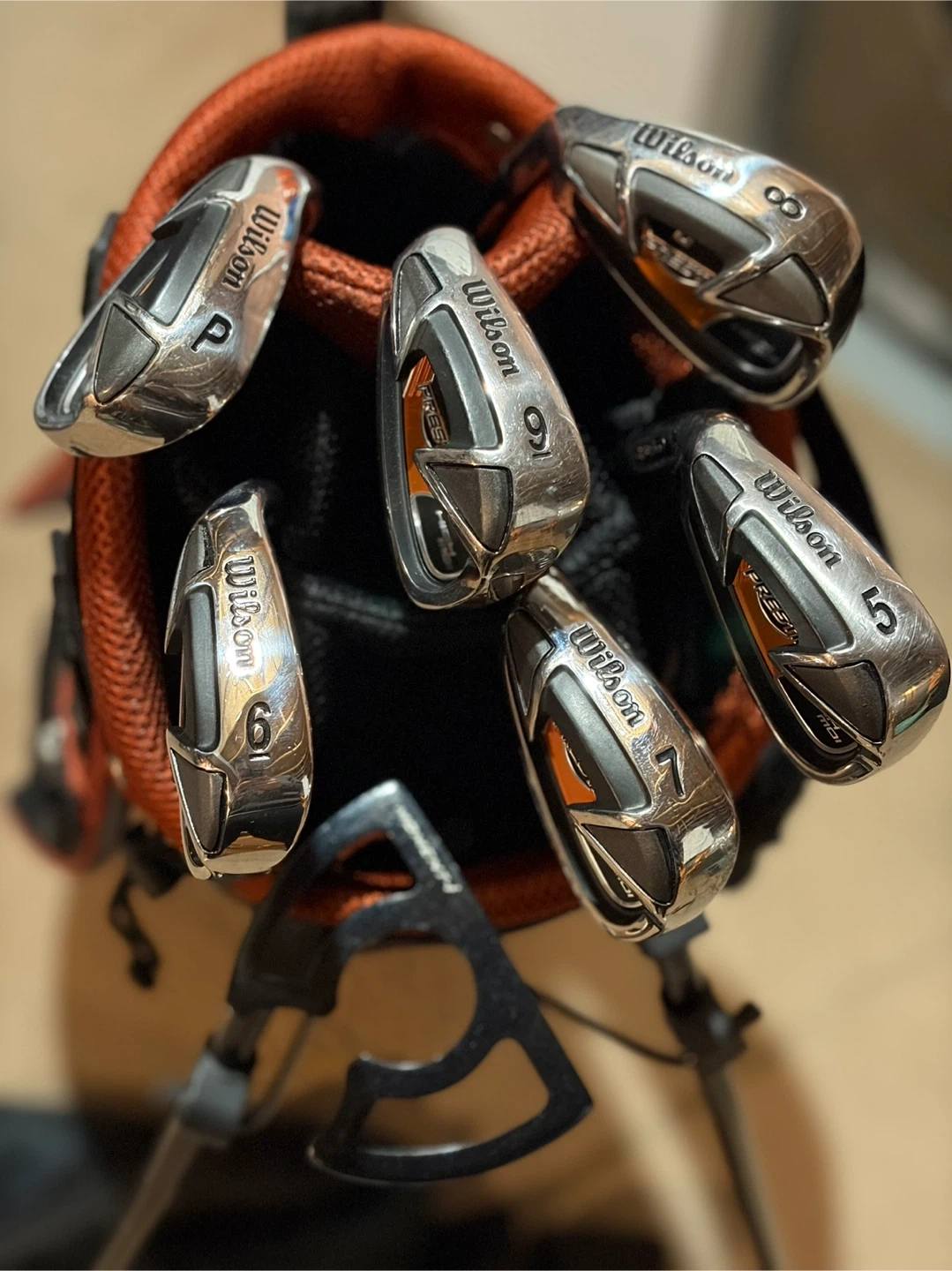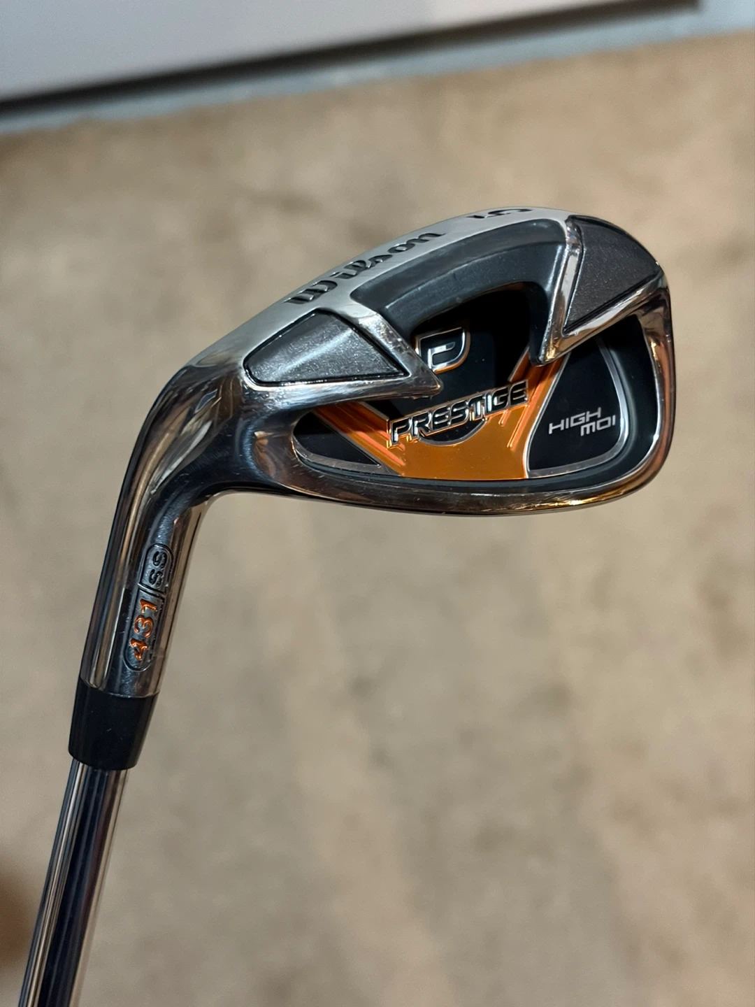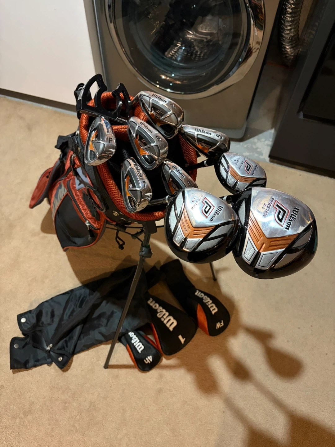 Complete Wilson Prestige golf club set with a stand bag. Includes irons and woods with High MOI technology for better performance. Bag is black and orange.