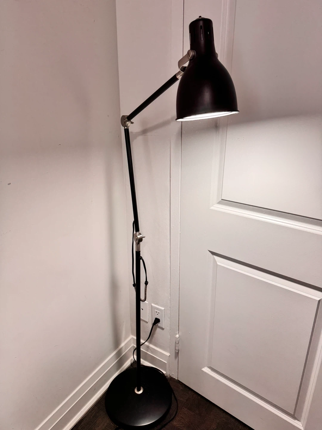 Adjustable black floor lamp with a metal shade. It has a flexible arm and a sturdy base for stability. This lamp is great for reading or task lighting.