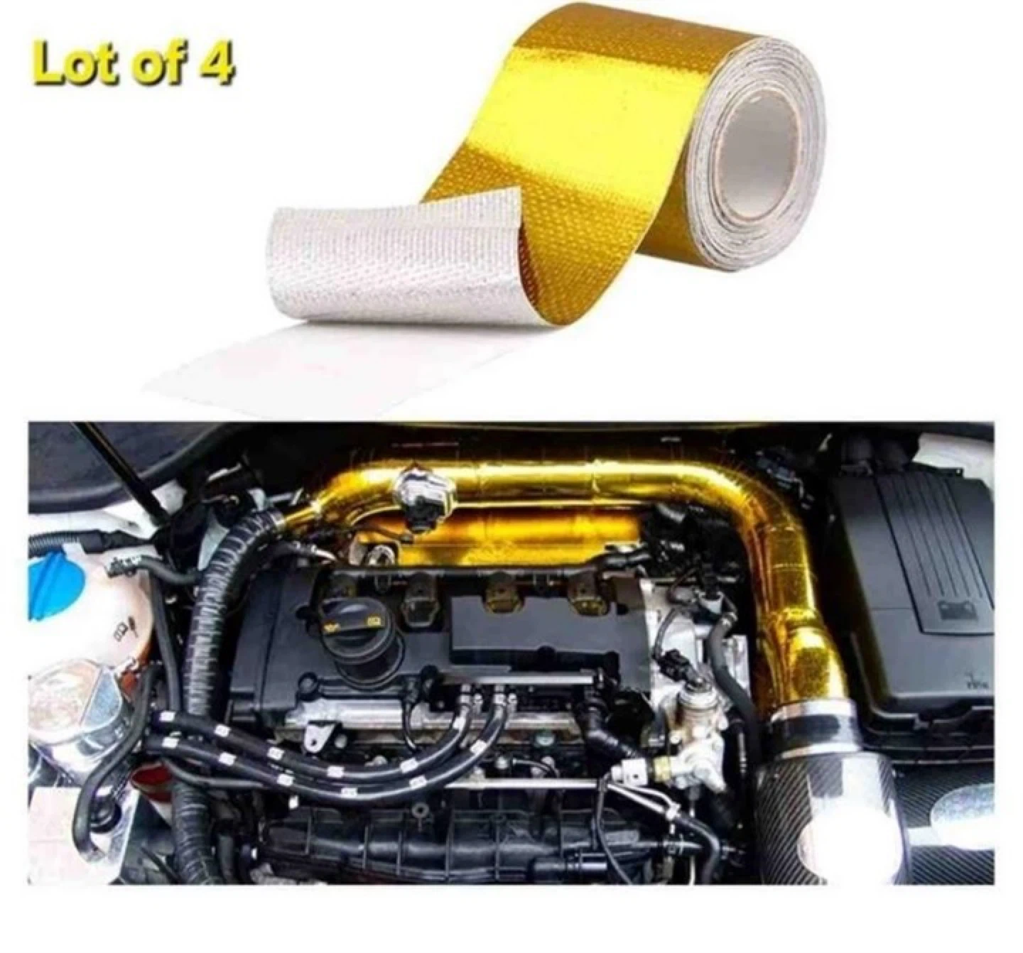 Lot of 4 Ryanstar Racing exhaust heat wrap tapes. Each roll is 10 meters long and 50mm wide. This is high-quality material designed for modified parts. It's gold coloured and made of fiberglass composite. This tape is useful for insulating engine components to help manage heat. It's typically used on exhaust systems or intake piping.