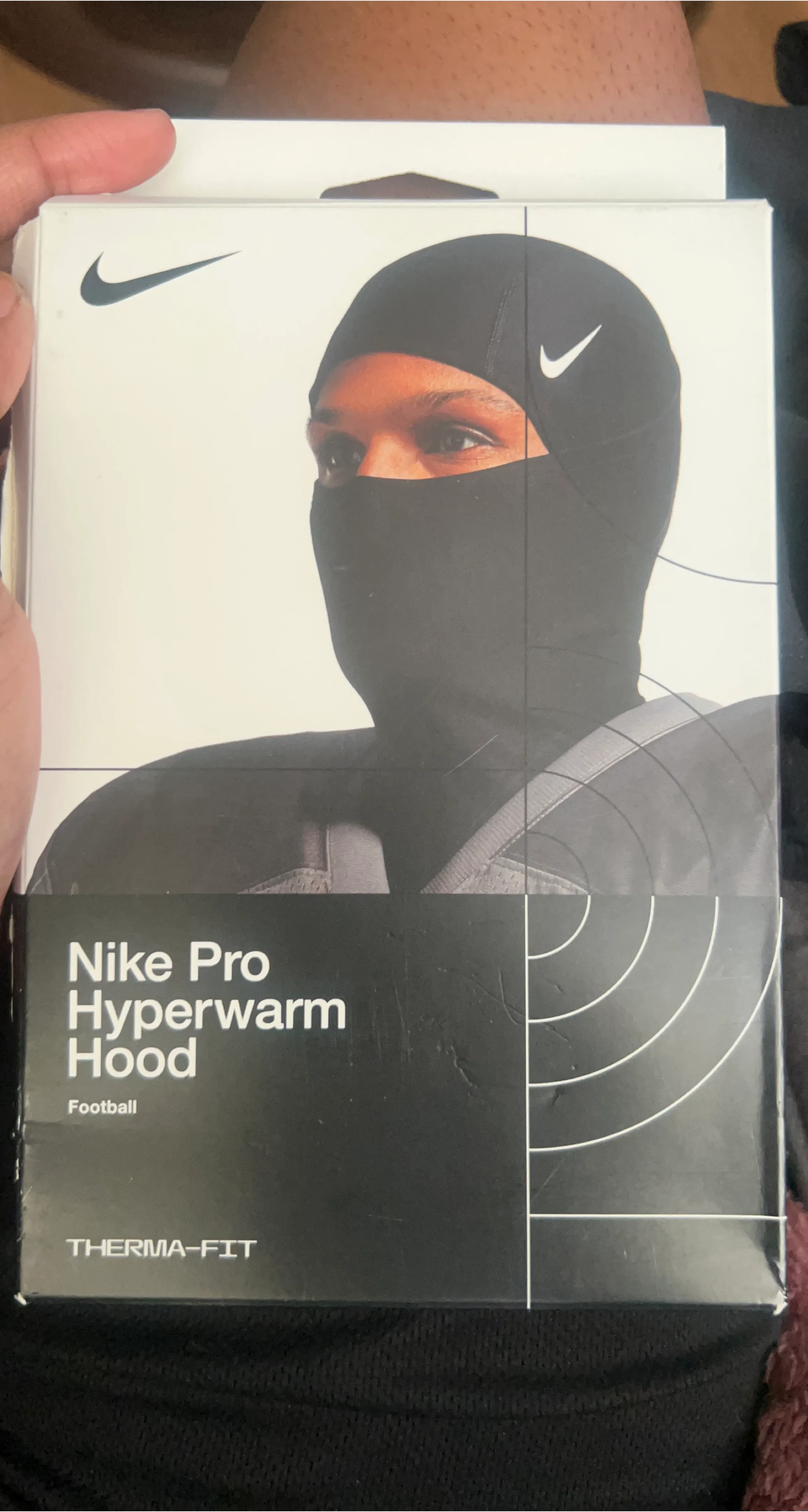 This is a Nike Pro Hyperwarm Hood designed for football. It's made with Therma-FIT technology to help keep you warm. This hood provides full head and face coverage.