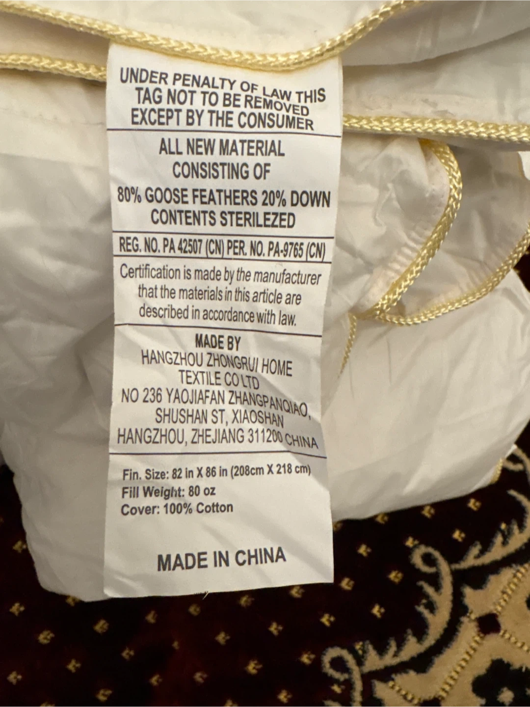 All new material duvet insert, 80% goose feathers and 20% down. Fill weight is 80 oz. Cover is 100% cotton. Made in China.