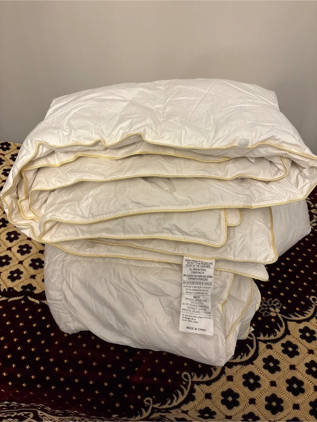 All new material duvet insert, 80% goose feathers and 20% down. Fill weight is 80 oz. Cover is 100% cotton. Made in China.