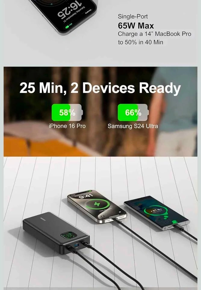 65W power bank is compatible with almost all USB C and USB A power devices, supporting PD3.0 QC2.0 QC3.0 FCP SCP AFC DCP BC1.2 APPLE 2.4A. It can quick charge your iPhone 16/15 series, MacBook, Dell XPS, SteamDeck, Laptop, iPad Pro, Samsung Galaxy S24, Google Pixel, and more. It can also charge low-power electronic devices like watches and headphones.