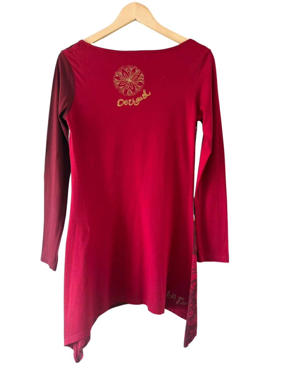 This Desigual long-sleeve tunic top is a vibrant red. It features a detailed mandala-style graphic patchwork with gold embroidery. The fabric shows some minor pilling on the sleeve, consistent with normal wear. Size M.