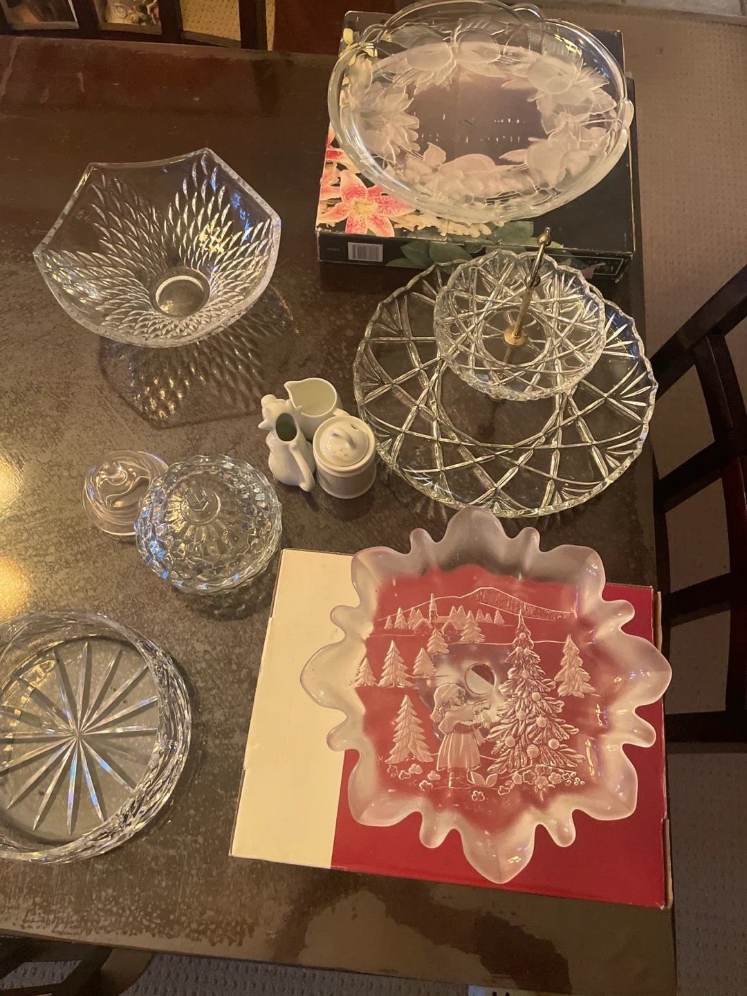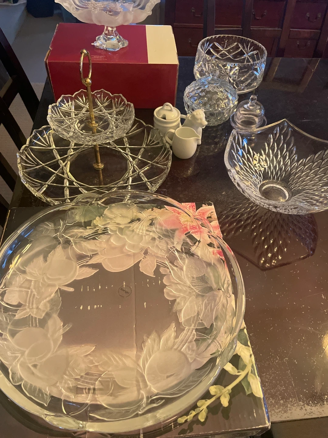 Set of various clear glass serving dishes and decorative bowls. Includes a tiered serving stand, a large etched platter with floral designs, a holiday-themed bowl with a frosted finish, a diamond-cut bowl, and a small creamer and sugar set. Great for entertaining or as decorative pieces.