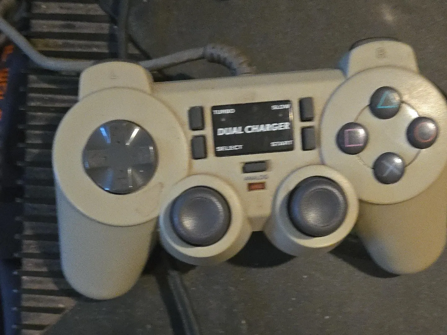 This is a Dual Charger controller for PlayStation consoles. It's a wired controller in a beige colour. It has two analog sticks and a directional pad.