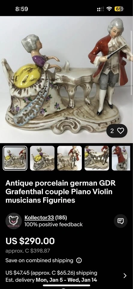This elegant piece depicts a classical musical scene featuring a violinist and a lady seated at a keyboard instrument, inspired by 18th-century Rococo style. A well-known subject produced by Grafenthal during the mid-20th century.