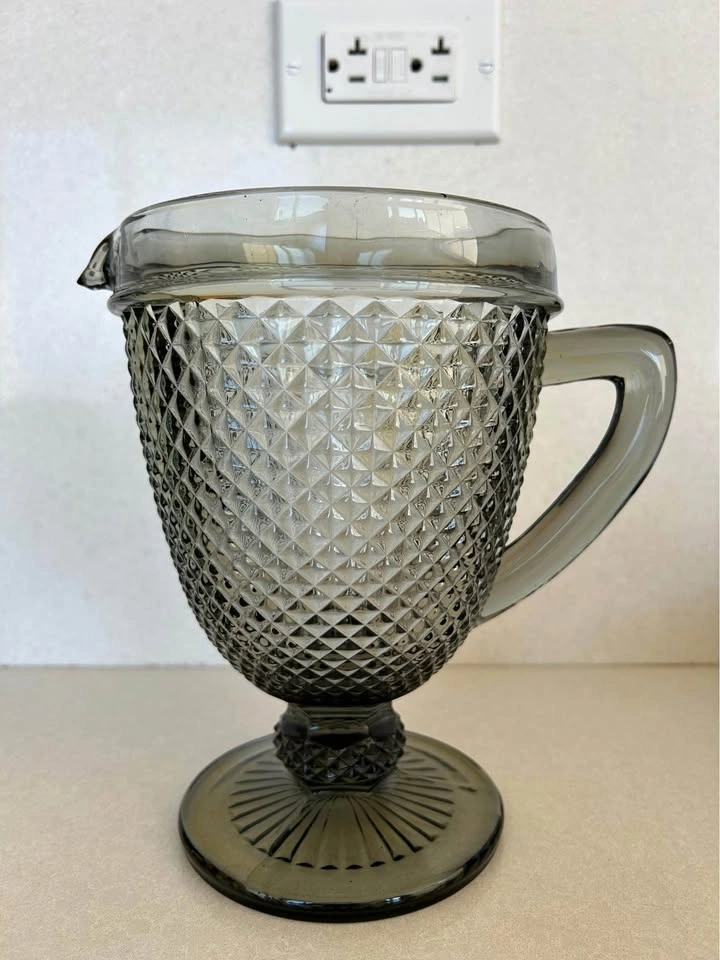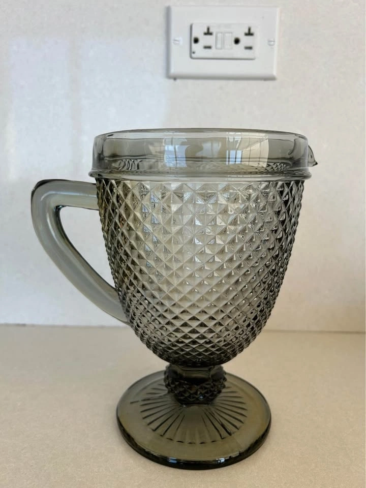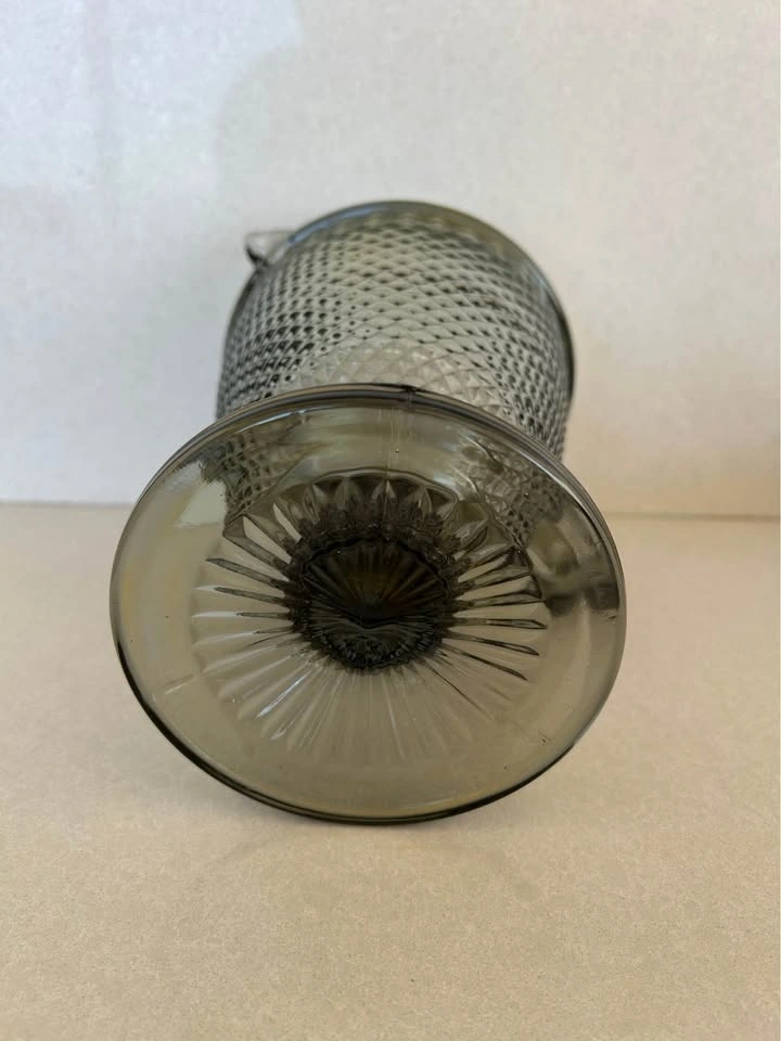 Vintage Stylish smoke gray glass pitcher with a cool diamond pattern texture. Features a handle and a nice pedestal base. Looks great for drinks or as decor. Holds 33 ounces (1 L) and is 8 inches tall.