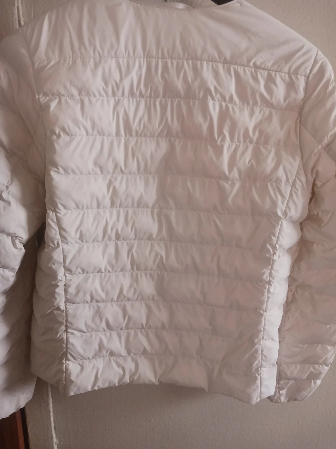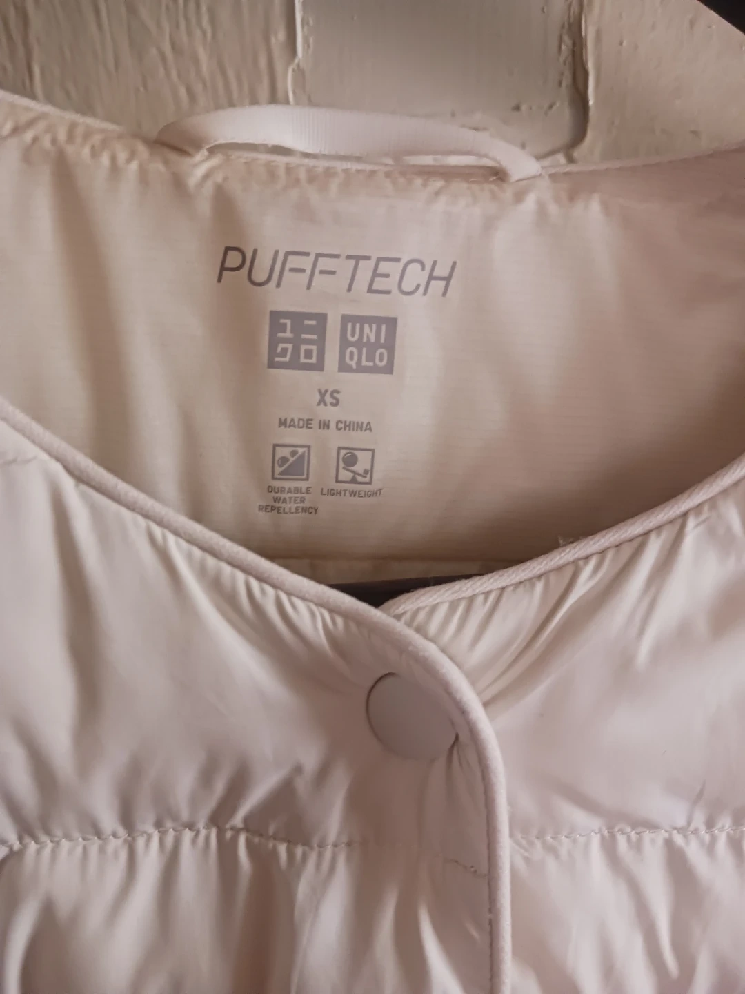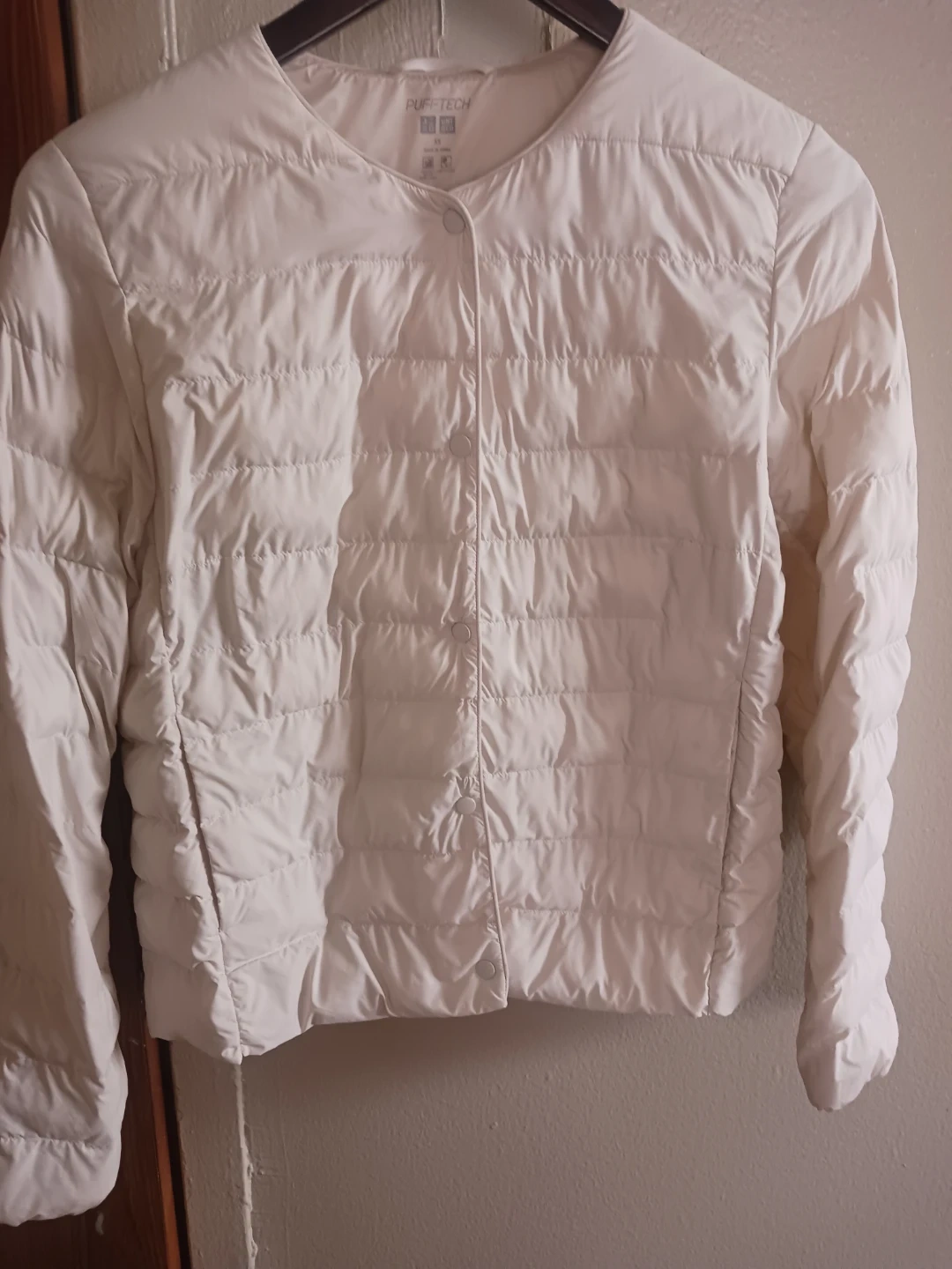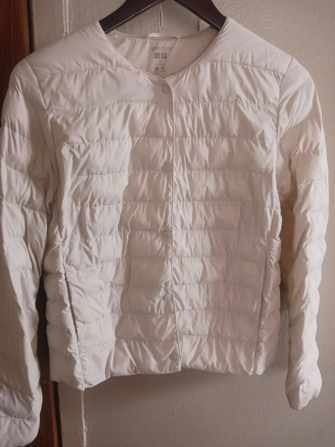 This Uniqlo jacket is a women's Ultra Light Down style in a light cream color. It features a snap button closure and a crew neck. It's lightweight and packable for easy layering. Use light clean