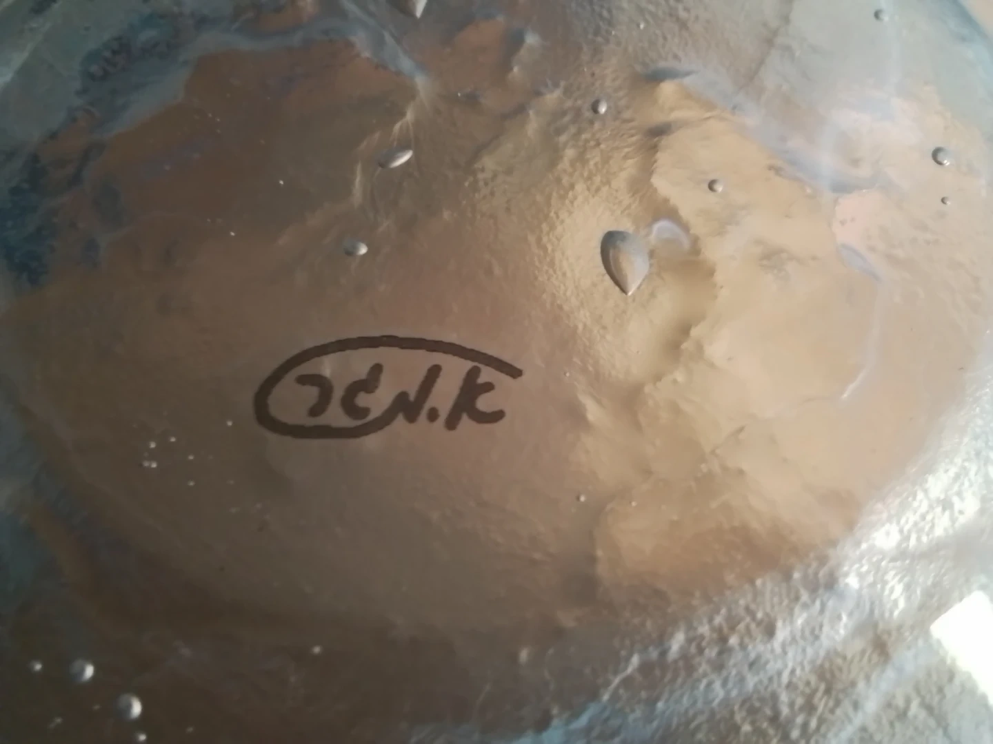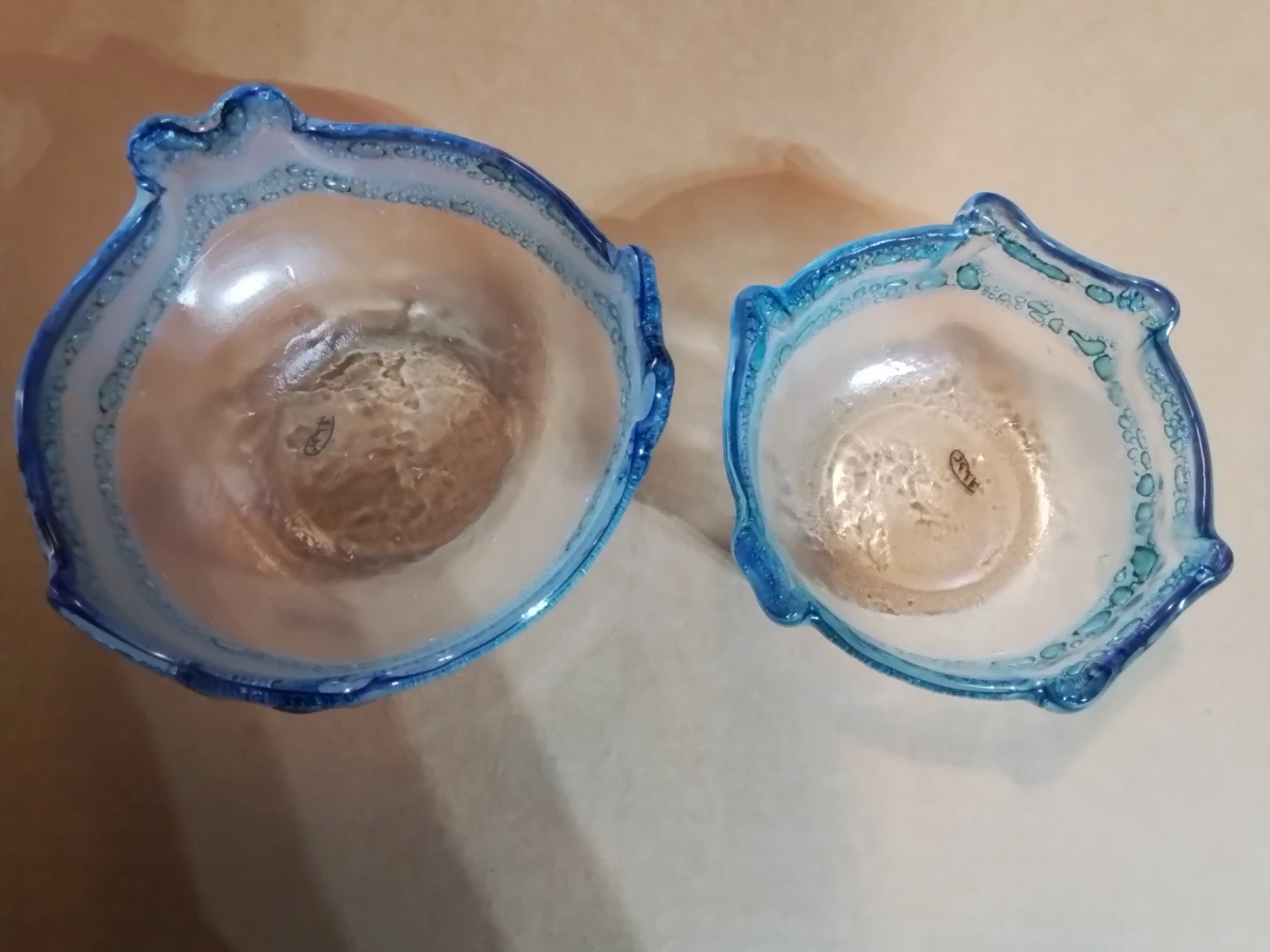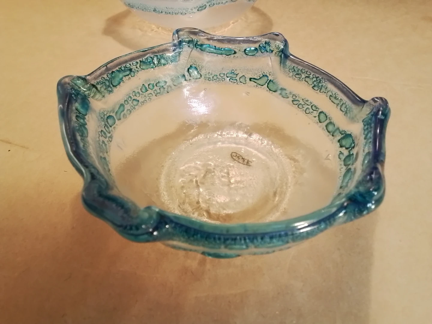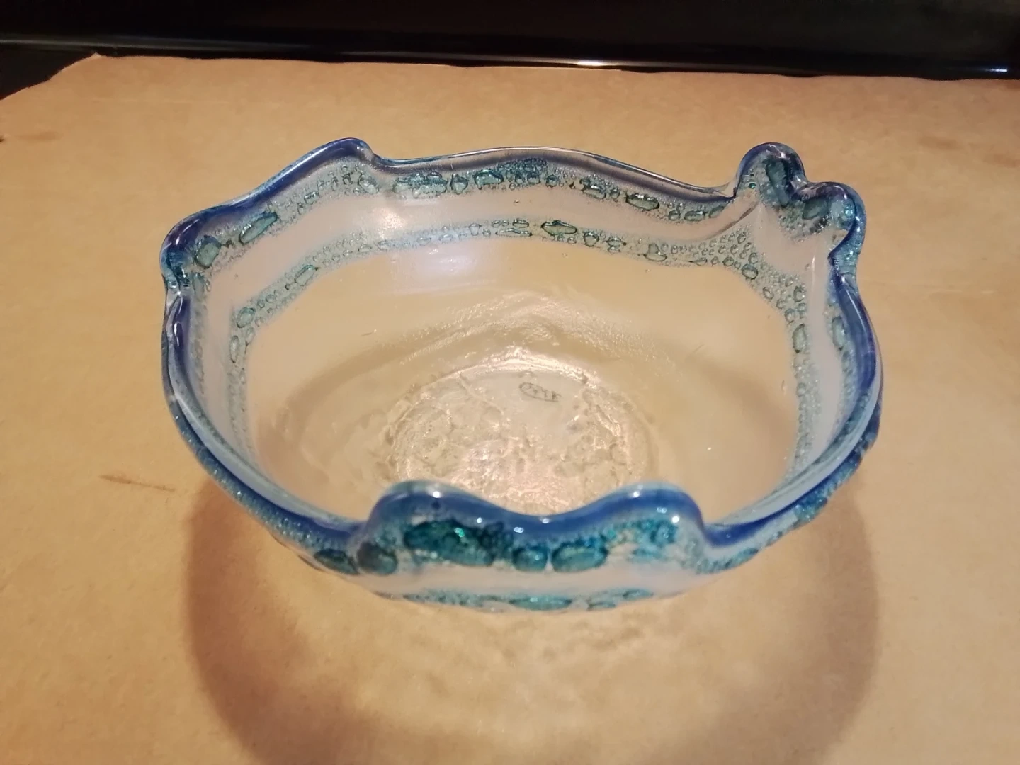 A decorative glass bowl with a blue and clear wavy rim. It has a unique, handmade look with small bubbles embedded in the glass. This piece would make a lovely centrepiece or candy dish.