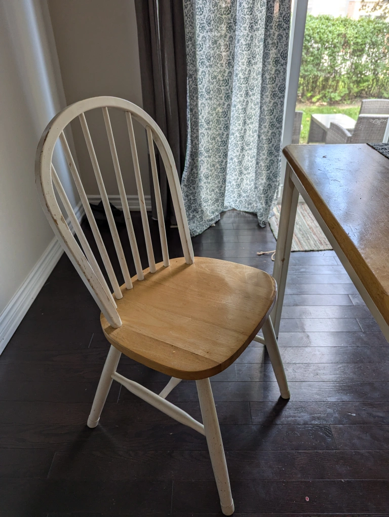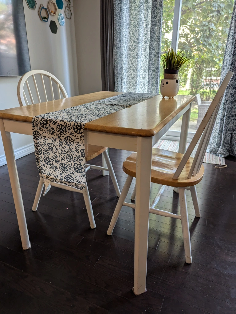 Simple yet stylish, this wooden dining set includes a table with a light wood finish and legs coloured white - perfect for small spaces or breakfast nooks. As a bonus, I'm throwing in a third chair for extra seating! The set is in great condition, sturdy , and adds a cozy vibe to any room. Ideal for enjoying meals, coffee chats, or working from home.