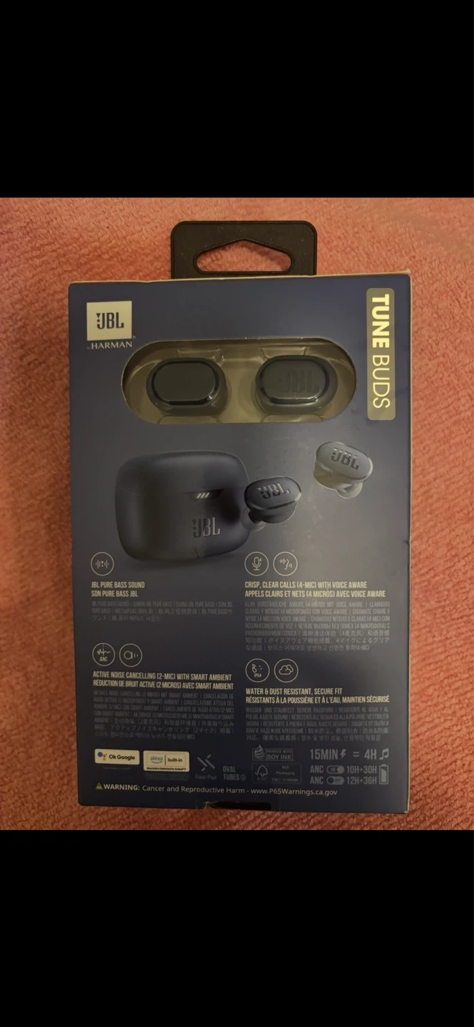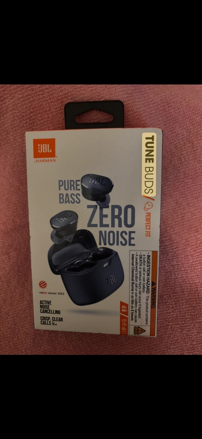 JBL Tune Buds true wireless earbuds. Features JBL Pure Bass Sound and Active Noise Cancelling. Water & dust resistant, secure fit. Includes charging case for up to 36 hours of playback.
