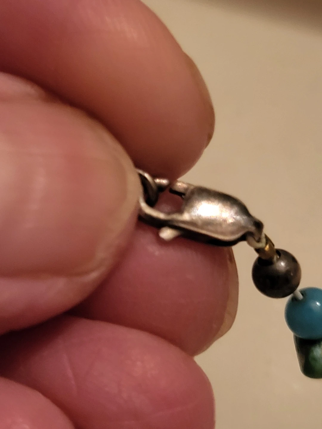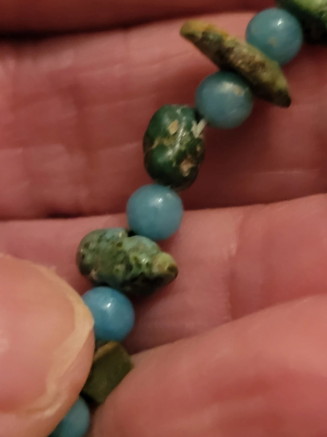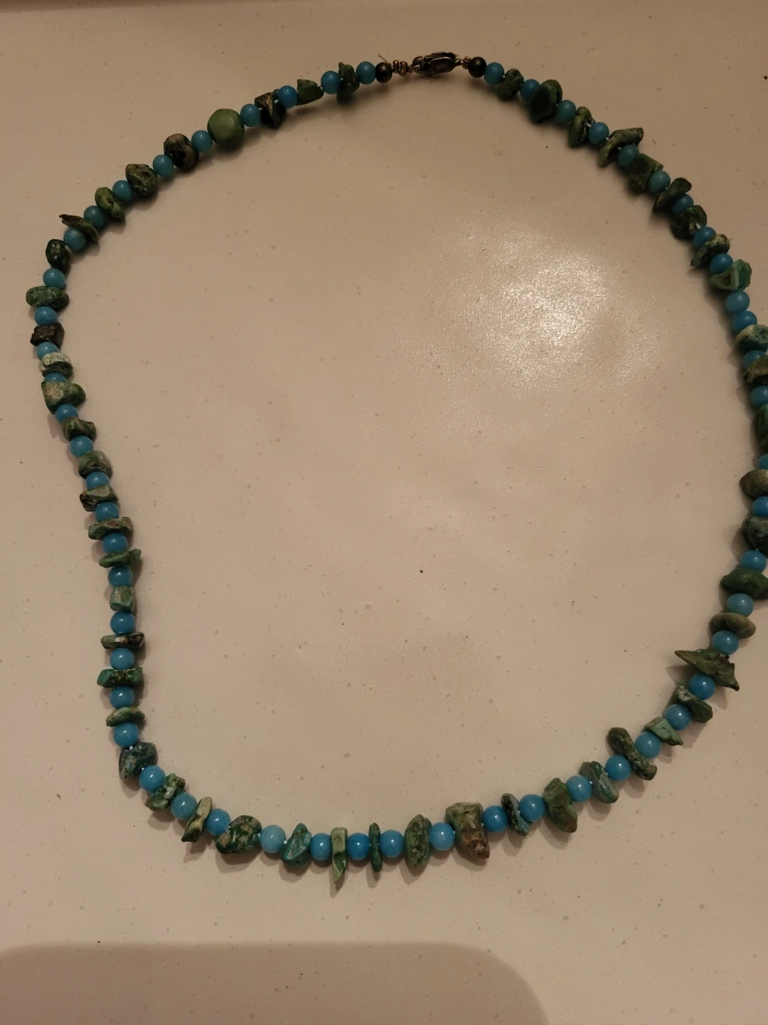 This is a beautiful beaded necklace featuring genuine turquoise and green stones. It's strung on a durable cord with a secure clasp. This necklace adds a pop of colour and natural elegance to any outfit!