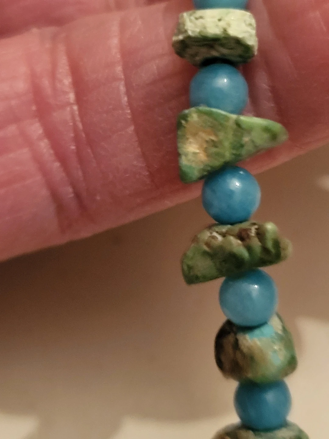 This is a beautiful beaded necklace featuring genuine turquoise and green stones. It's strung on a durable cord with a secure clasp. This necklace adds a pop of colour and natural elegance to any outfit!