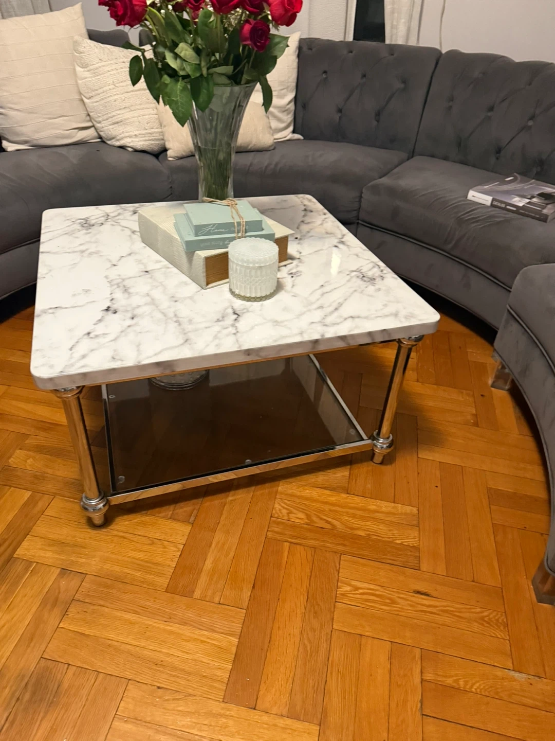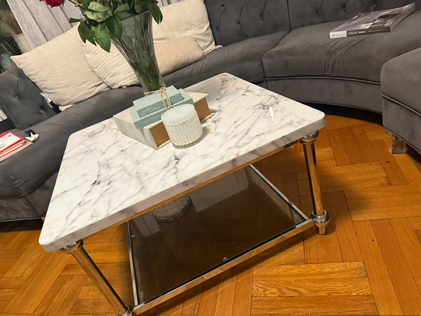 This square coffee table features a white marble top and a mirrored bottom shelf. It has a chrome metal frame and legs. This table's design offers a touch of modern elegance to any living space. It's great for holding drinks, books, or decorative items.