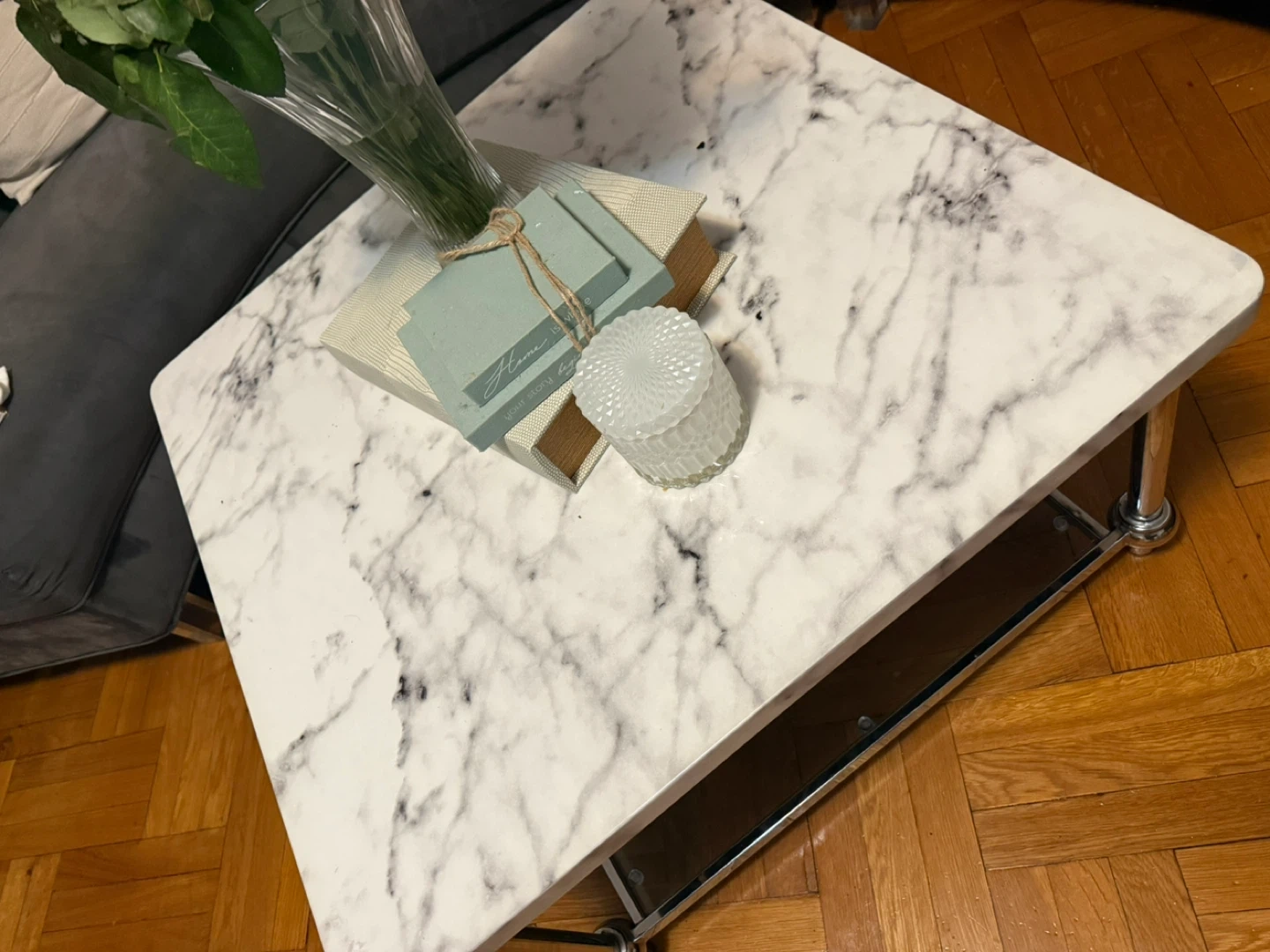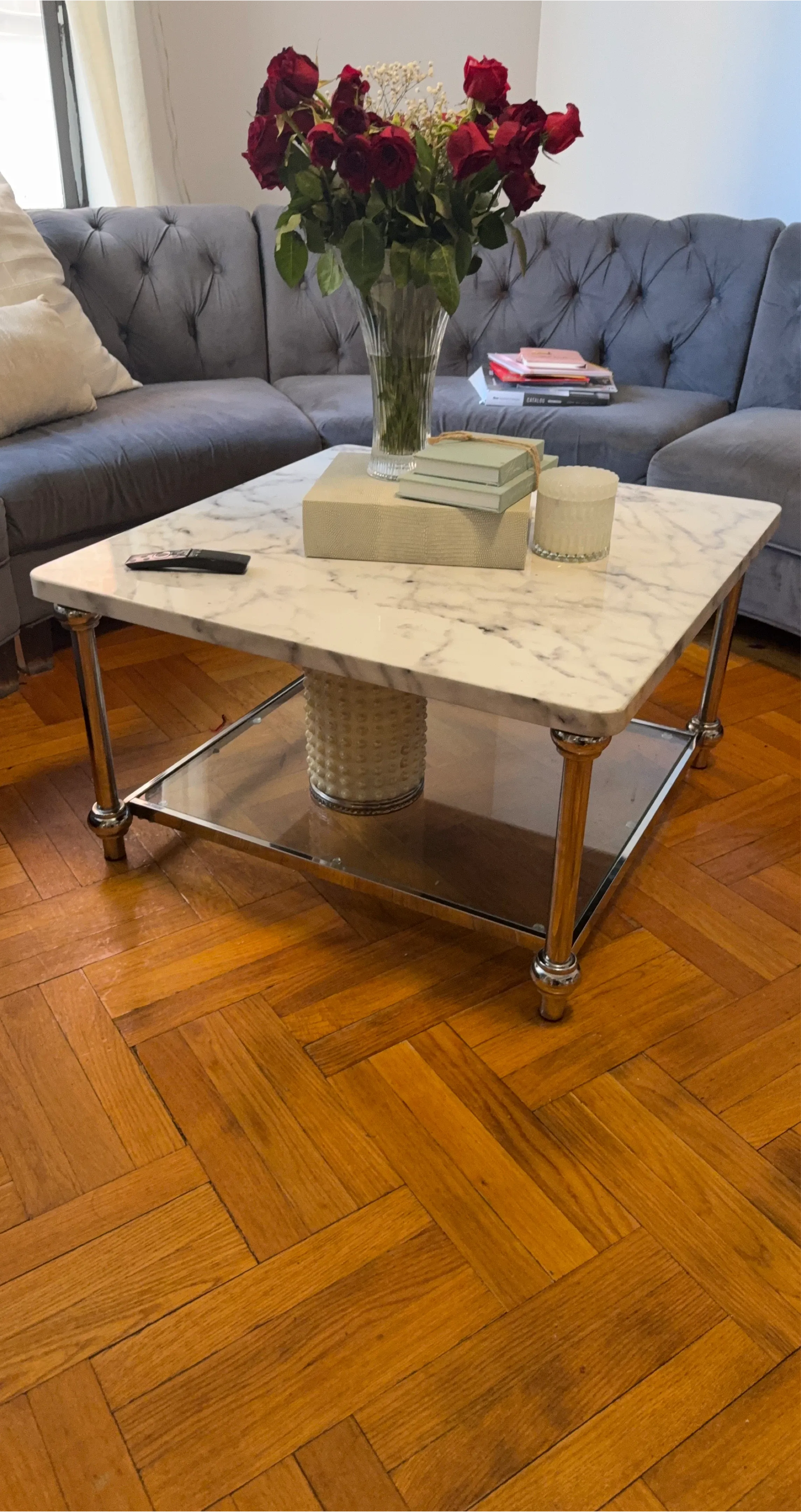 This square coffee table features a white marble top and a mirrored bottom shelf. It has a chrome metal frame and legs. This table's design offers a touch of modern elegance to any living space. It's great for holding drinks, books, or decorative items.