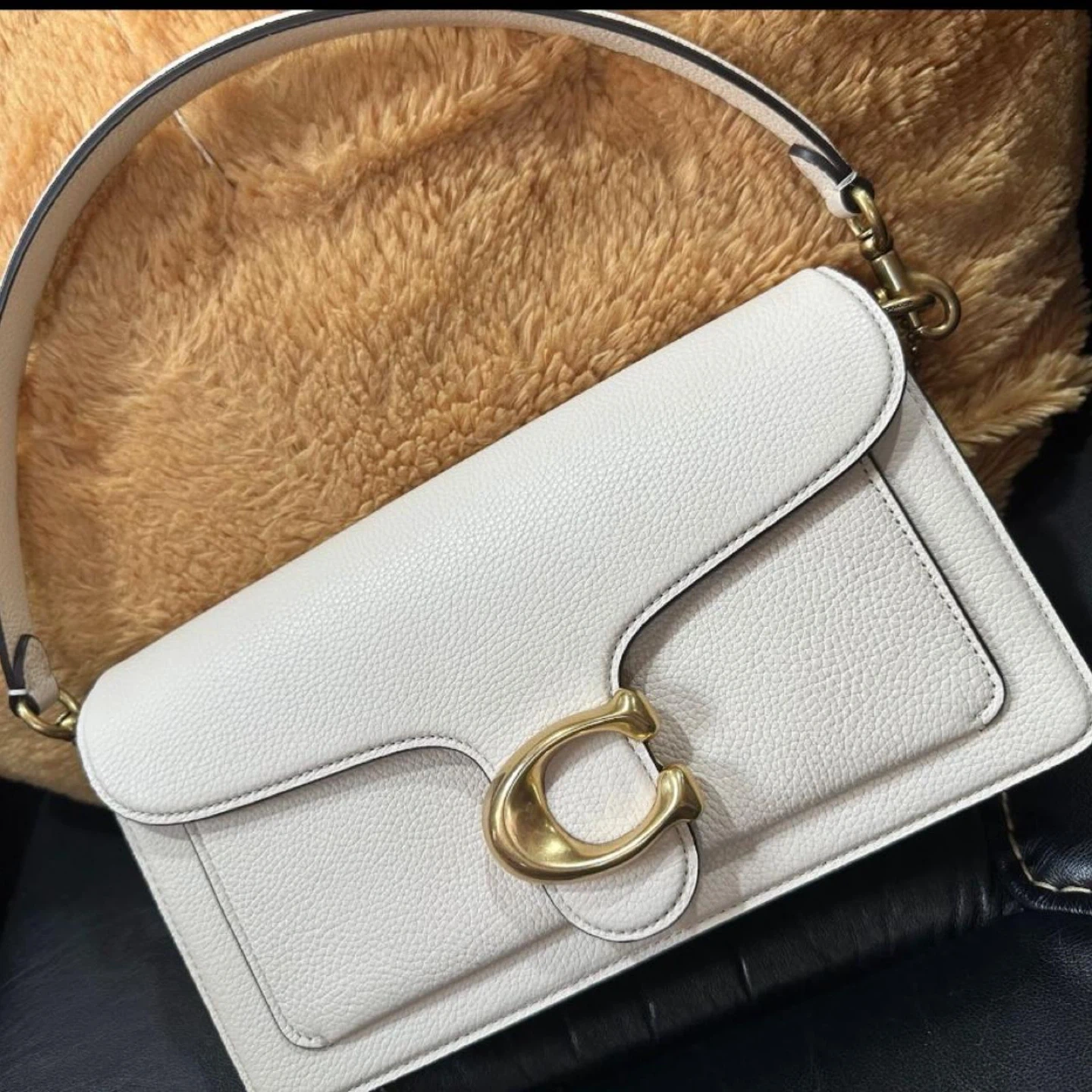 This is a Coach Tabby shoulder bag in white pebble leather. It features gold-tone hardware and a turn-lock closure. Pebble leather material. $150 cash