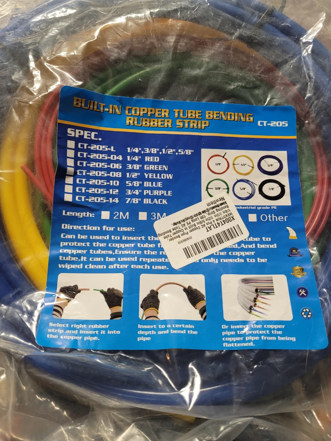 This is a built-in copper tube bending rubber strip. It comes in multiple sizes and colours including 1/4" red, 3/8" green, 1/2" yellow, 5/8" blue, 3/4" purple, and 7/8" black. The length is available in 2M or 3M. It's designed to protect copper tubes and ensure the tube can be bent without flattening. Select the right rubber strip and insert it into the copper pipe.