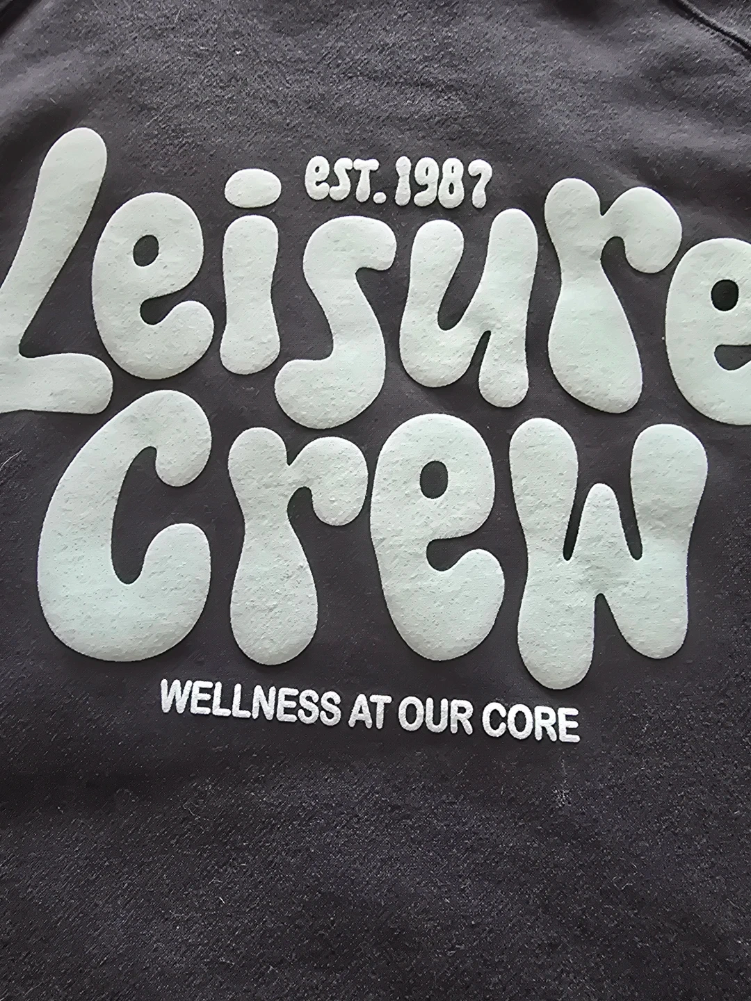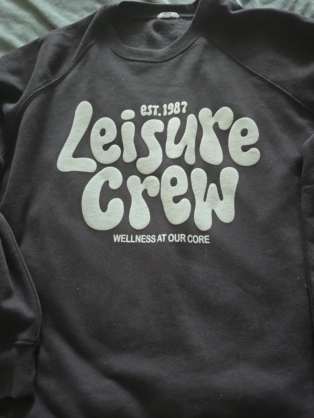Grey Ardene sweatshirt with "Leisure Crew" graphic. It's a size M/M and features "est. 1987" and "Wellness at Our Core" text. This pullover style is comfortable and casual.