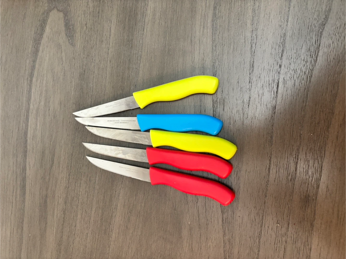 Selling a set of 5 paring knives with stainless steel blades and colourful plastic handles. There are two red, two yellow, and one blue. They are in great condition and ready for a new home!