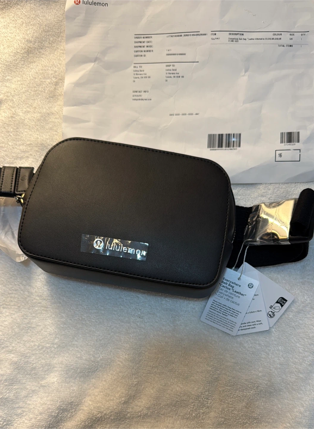 It's the Lululemon Everywhere Belt Bag in a 1L size. This bag is made from a leather alternative in black. It's a versatile accessory for everyday use.