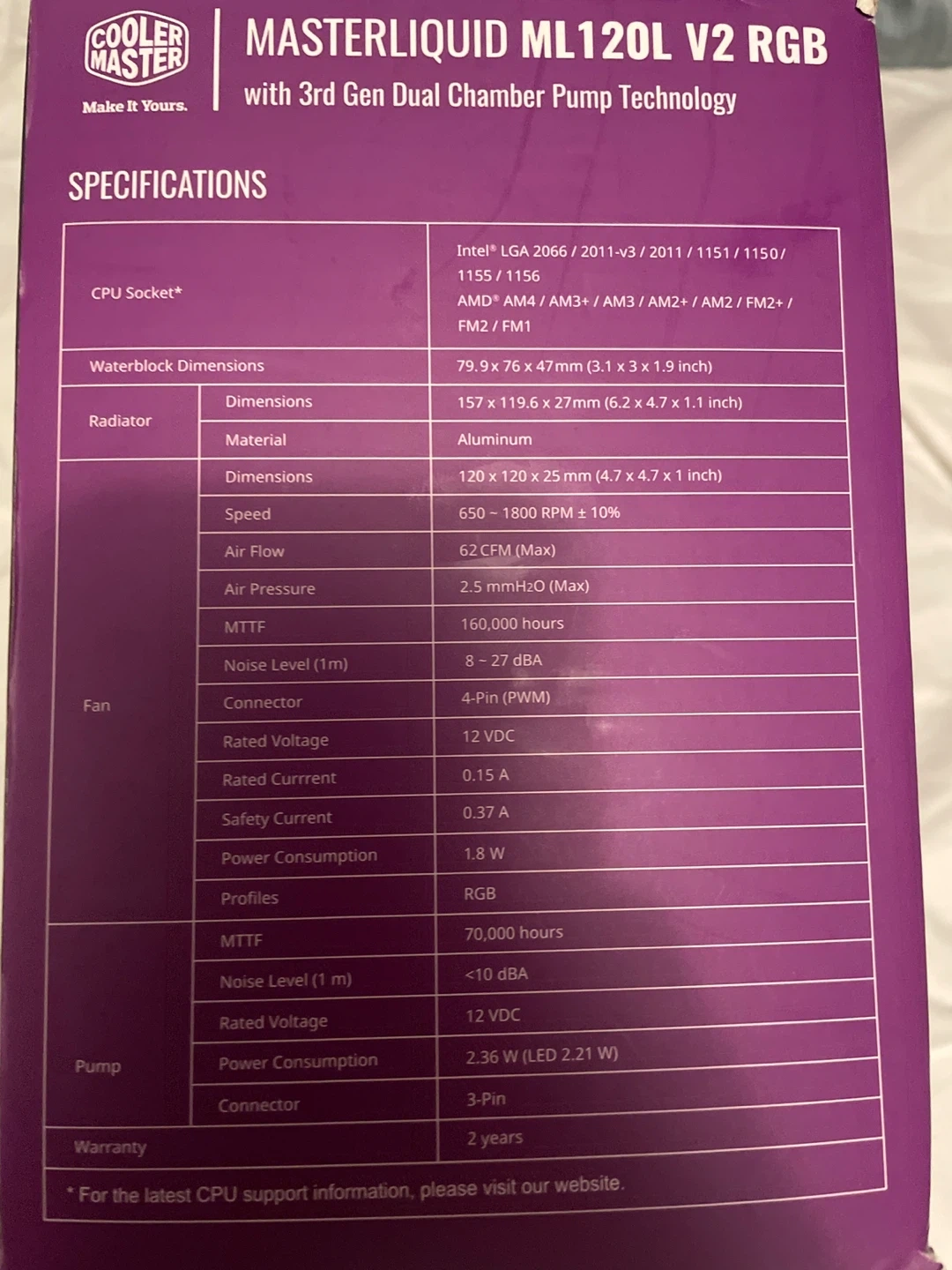 This Cooler Master MasterLiquid ML120L V2 RGB features 3rd Gen Dual Chamber Pump technology for improved cooling efficiency. It's designed with a built-in RGB lighting system and includes customizable RGB lighting that's compatible with most motherboards. The radiator is made of aluminum and measures 120 x 120 x 25 mm.