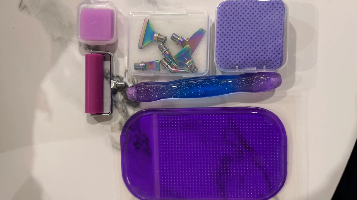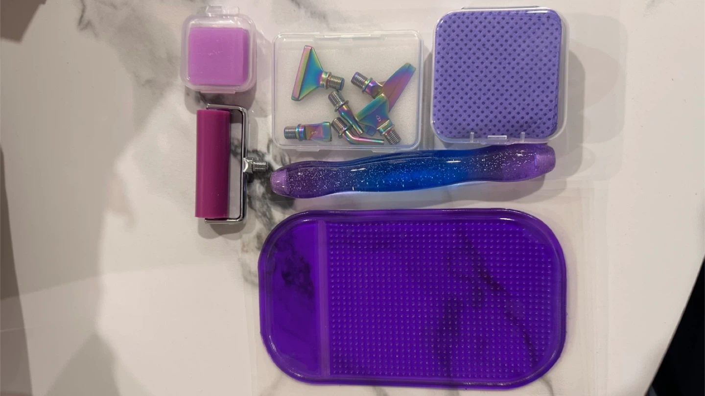 Selling a purple diamond painting tool kit. It includes a variety of tools to help you with your diamond painting projects, such as a roller, multiple tips, and cleaning supplies. Perfect for getting started or expanding your current set!