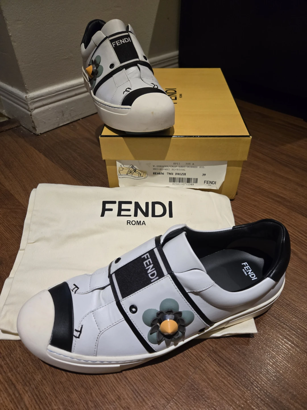 Fendi Roma sneakers in white calf leather. Features a rubber sole and decorative flower embellishment. Includes original box and dust bag.