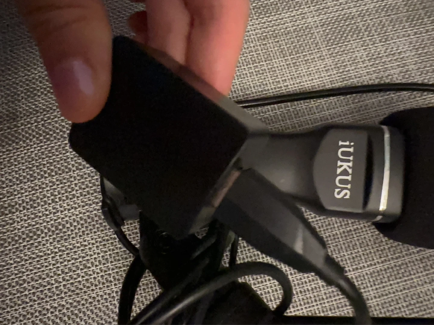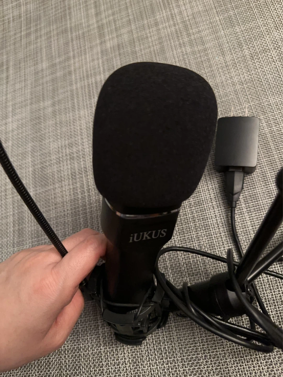 Black iKUS USB microphone, perfect for recording or streaming. Comes with a pop filter and is powered via USB.