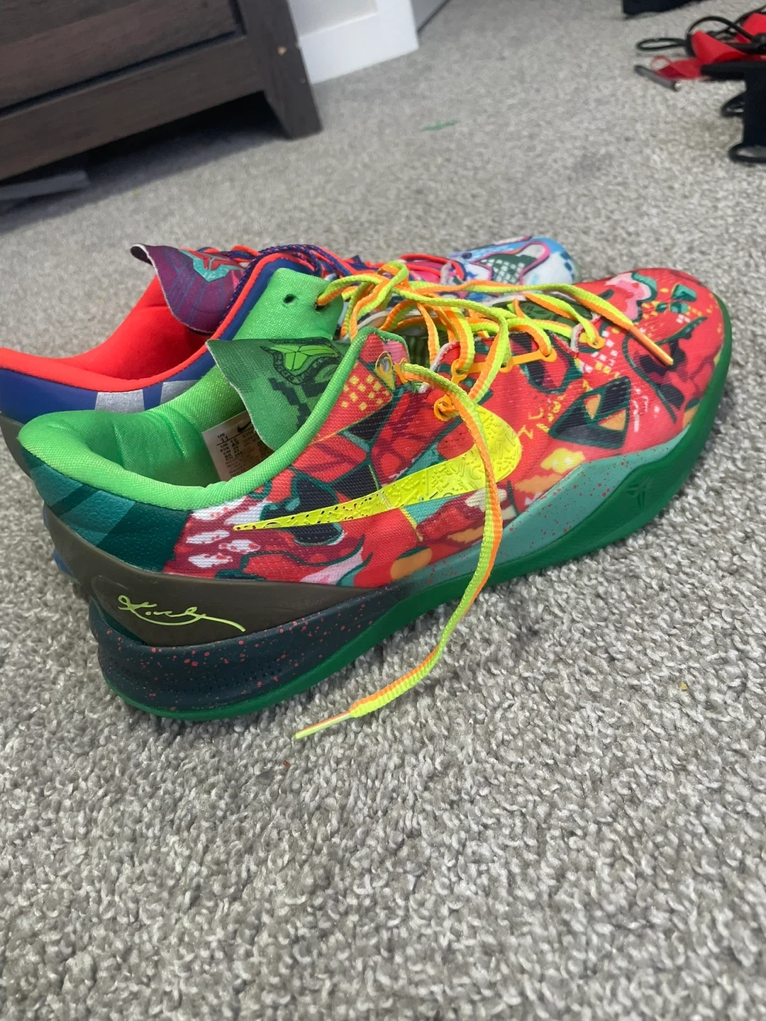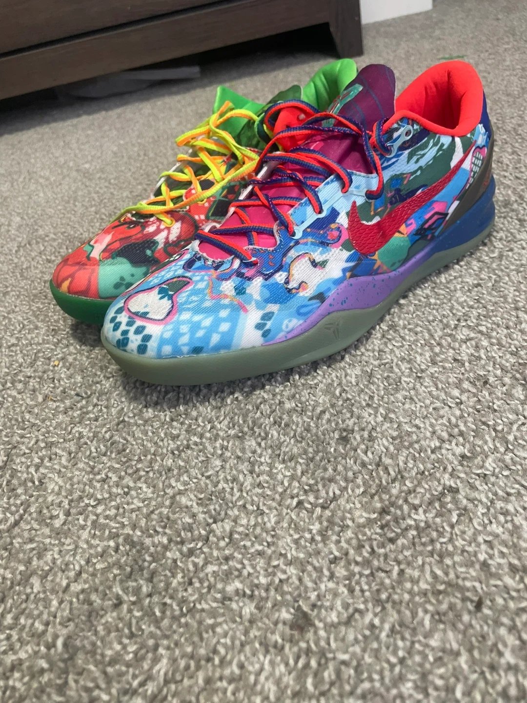 These Nike Kobe 8 "What The" sneakers feature a wild, mismatched design. They have colourful patterned uppers with red, blue, green, and yellow accents. The soles are green and speckled black. A true collector's item!