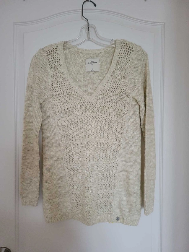 This is an Abercrombie Kids sweater in XL. It's in good condition and ready to wear! I'm clearing out space in my closet, and this sweater deserves a new home. It features a V-neck and long sleeves, perfect for layering or wearing on its own during those breezy days. If the ad is still up, it's still available!