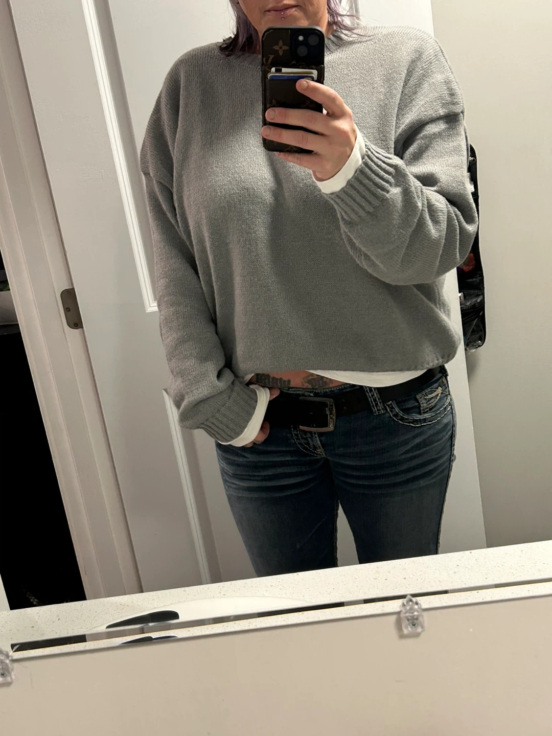Selling a cozy grey knit sweater. It's a great layering piece for the cooler weather! The material feels soft and comfortable, perfect for everyday wear. Only worn once. For reference I am 5’9 and about 180pnds. That is me in the photos.